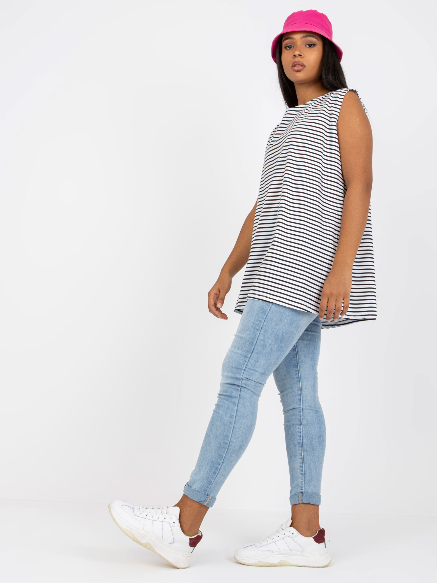 Modelka ma na sobie rozmiar one size. Wymiary modelki: wzrost 179 cm, biust 116 cm, talia 98 cm, biodra 119 cm.
