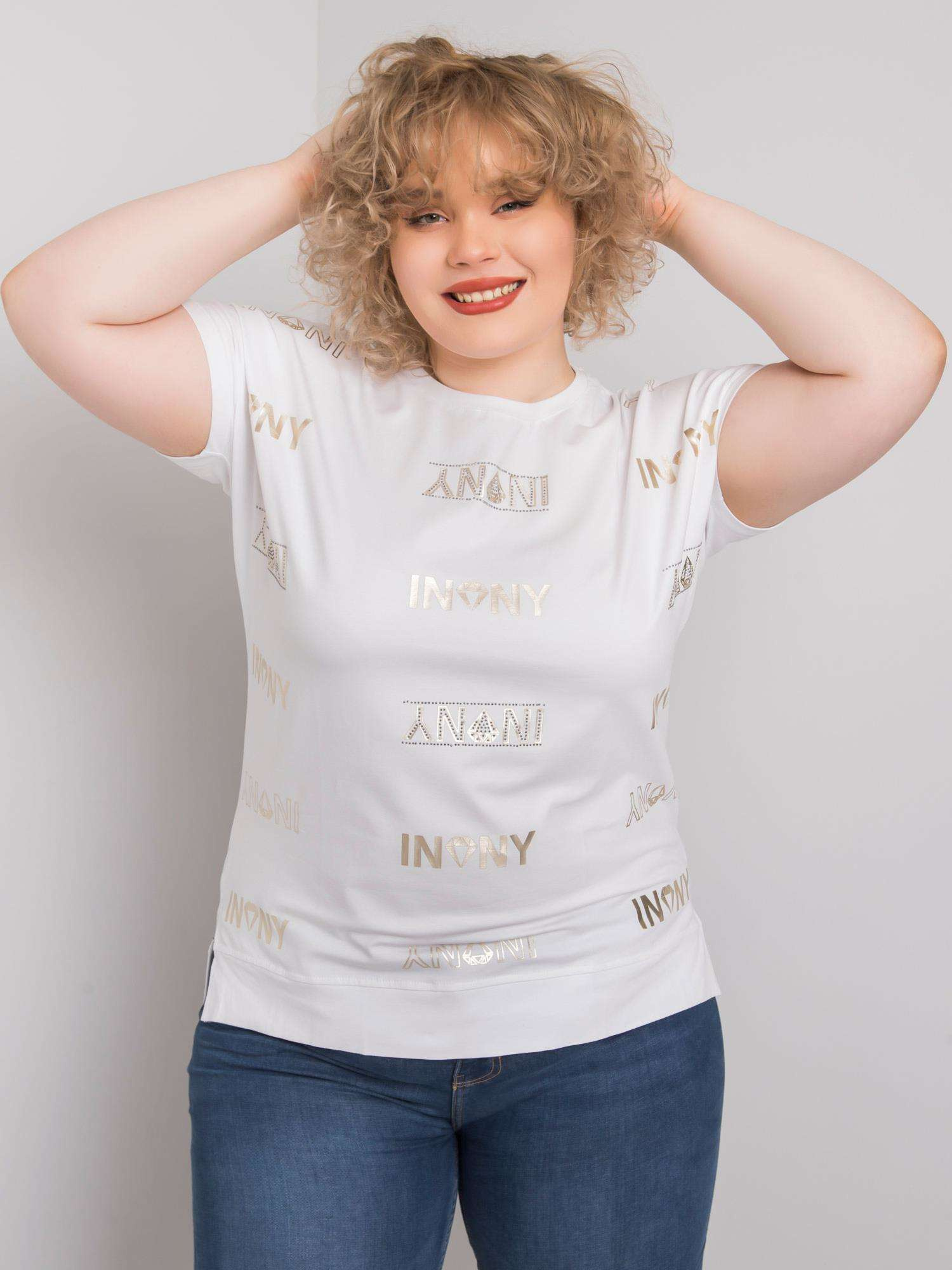 Biała bluzka plus size z nadrukiem i aplikacją.