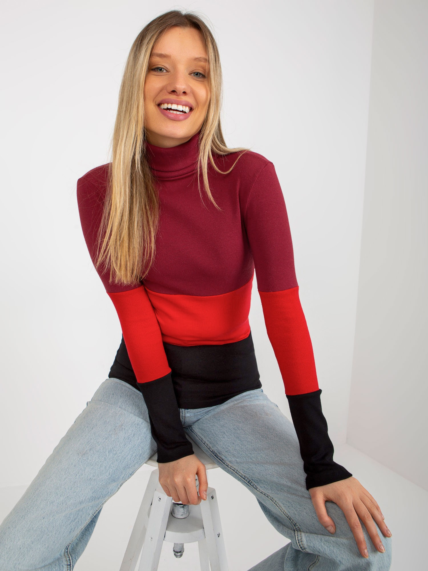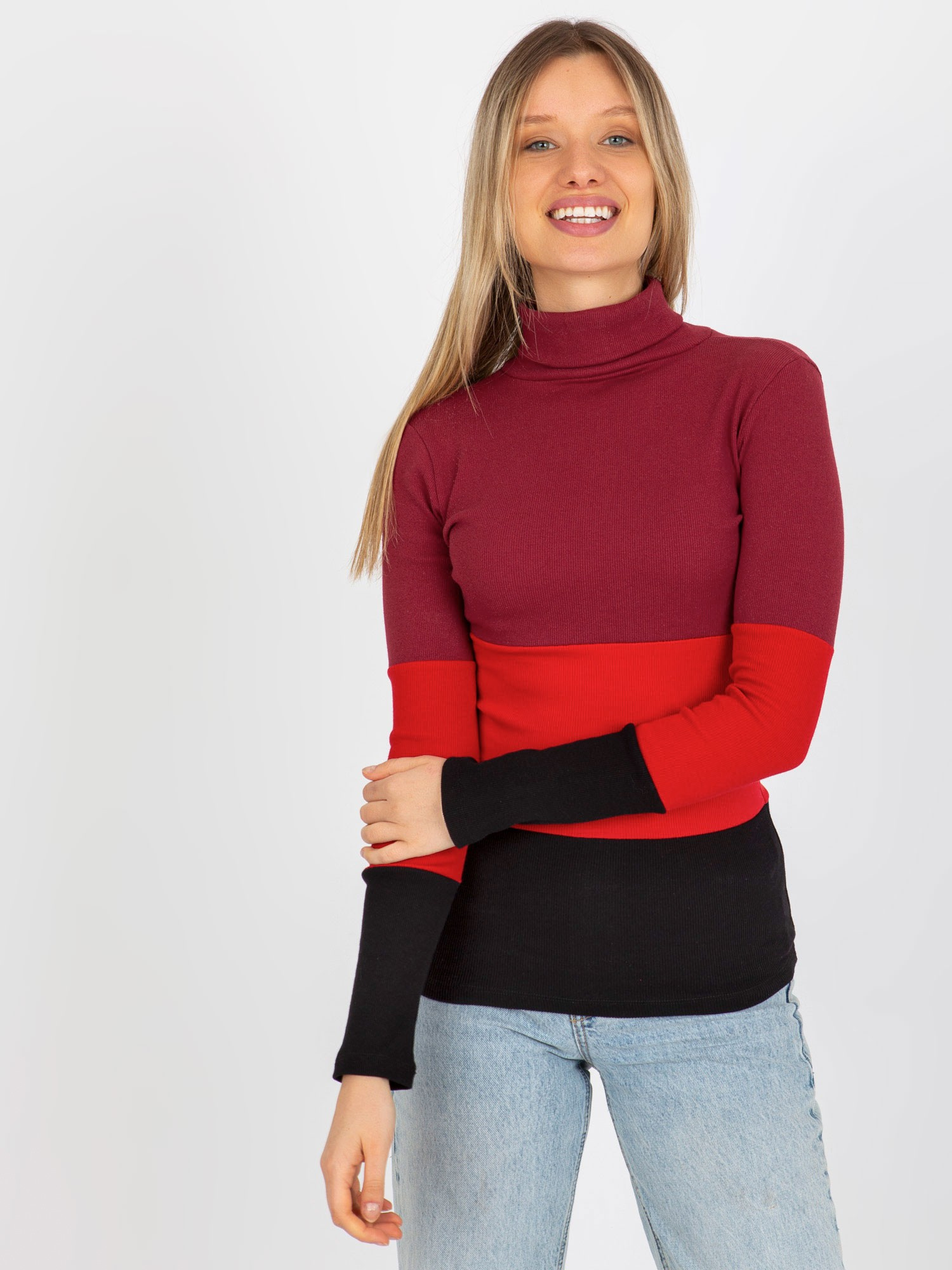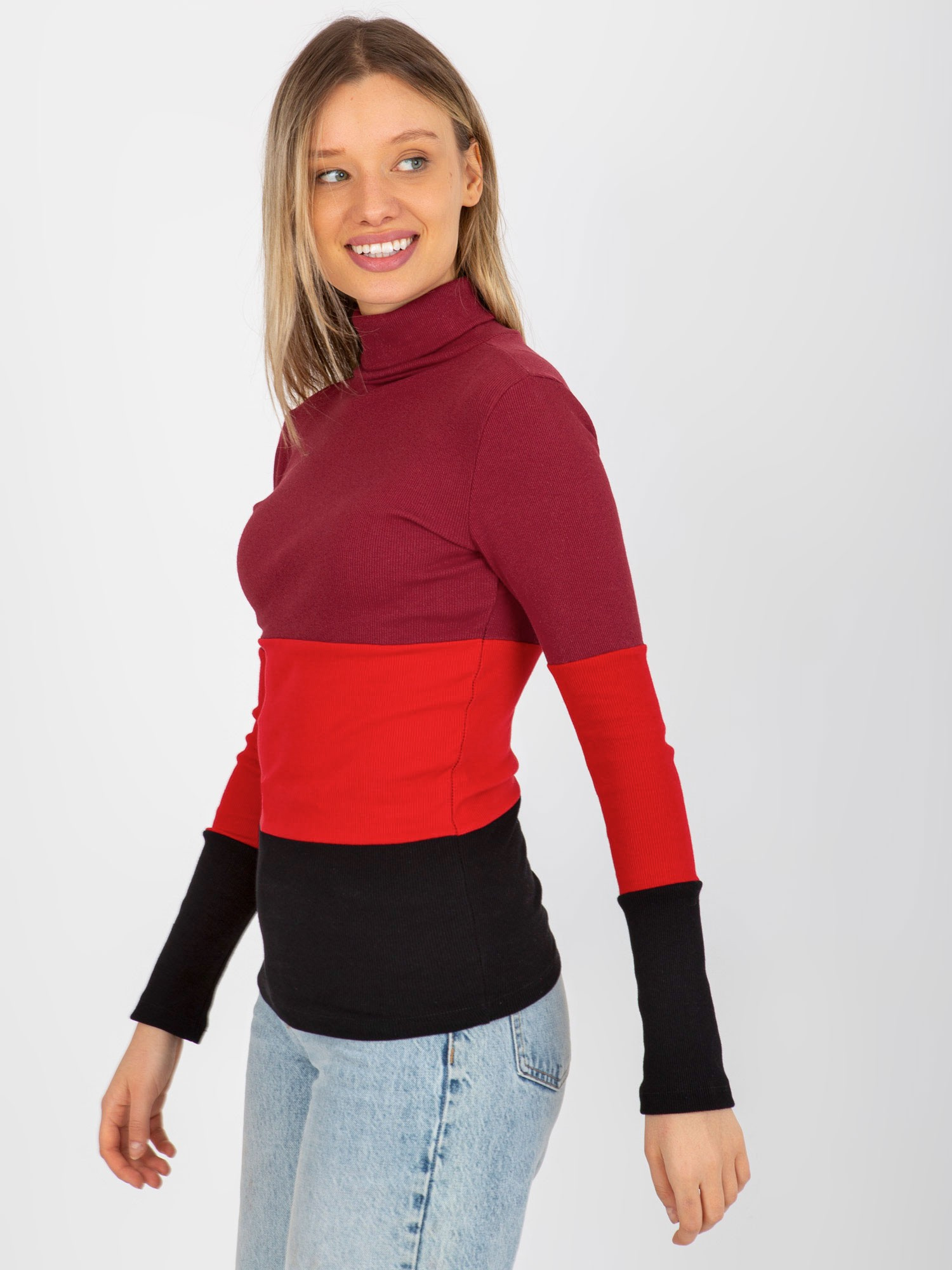 Bordowo-czarna dopasowana bluzka basic z golfem w prążek .