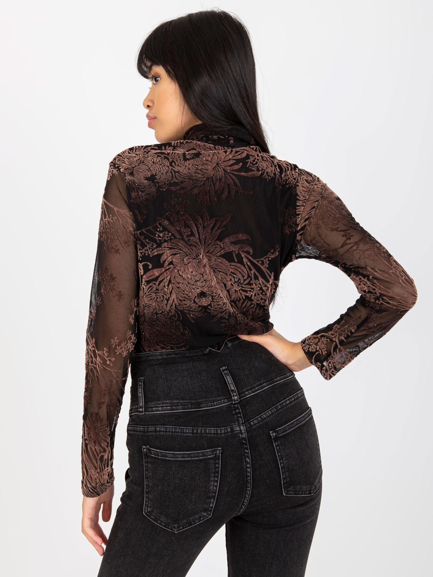 Wymiary bluzki w rozmiarze one size mierzone na płasko: szerokość pod pachami – 62 cm, długość całkowita (przód) – 61 cm, długość całkowita (tył) – 65 cm .