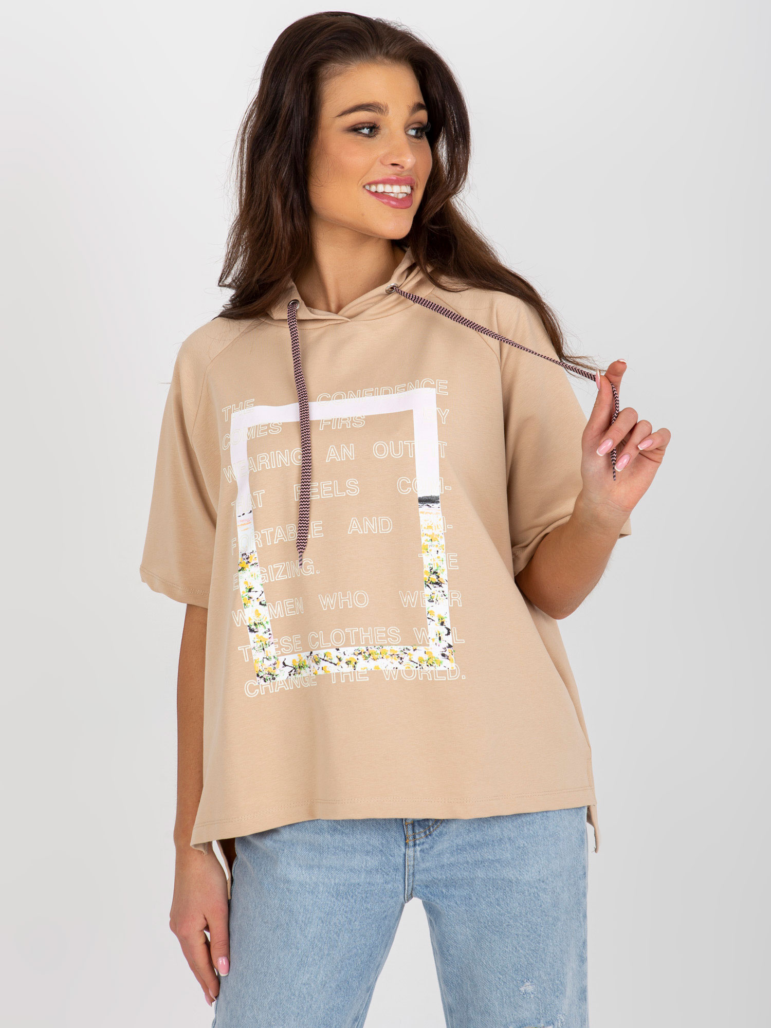 Camelowa luźna bluzka z nadrukiem i kapturem .