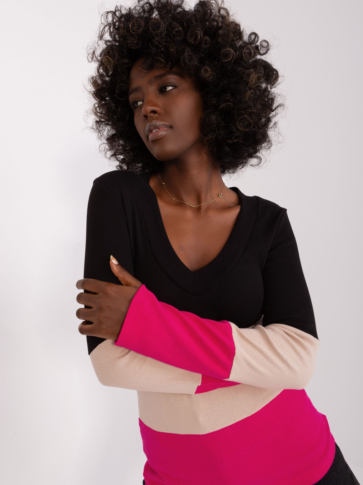 Ecru-fuksjowa bluzka basic z długim rękawem .