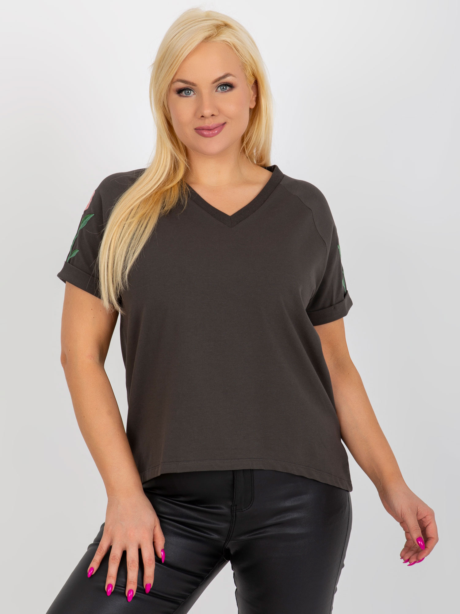 Khaki bawełniana bluzka plus size z dekoltem V .