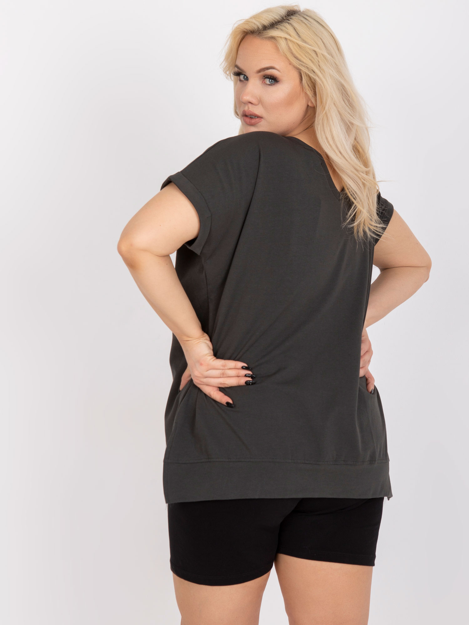 Wymiary bluzki w rozmiarze one size mierzone na płasko: szerokość pod pachami – 62 cm, długość całkowita – 73 cm.