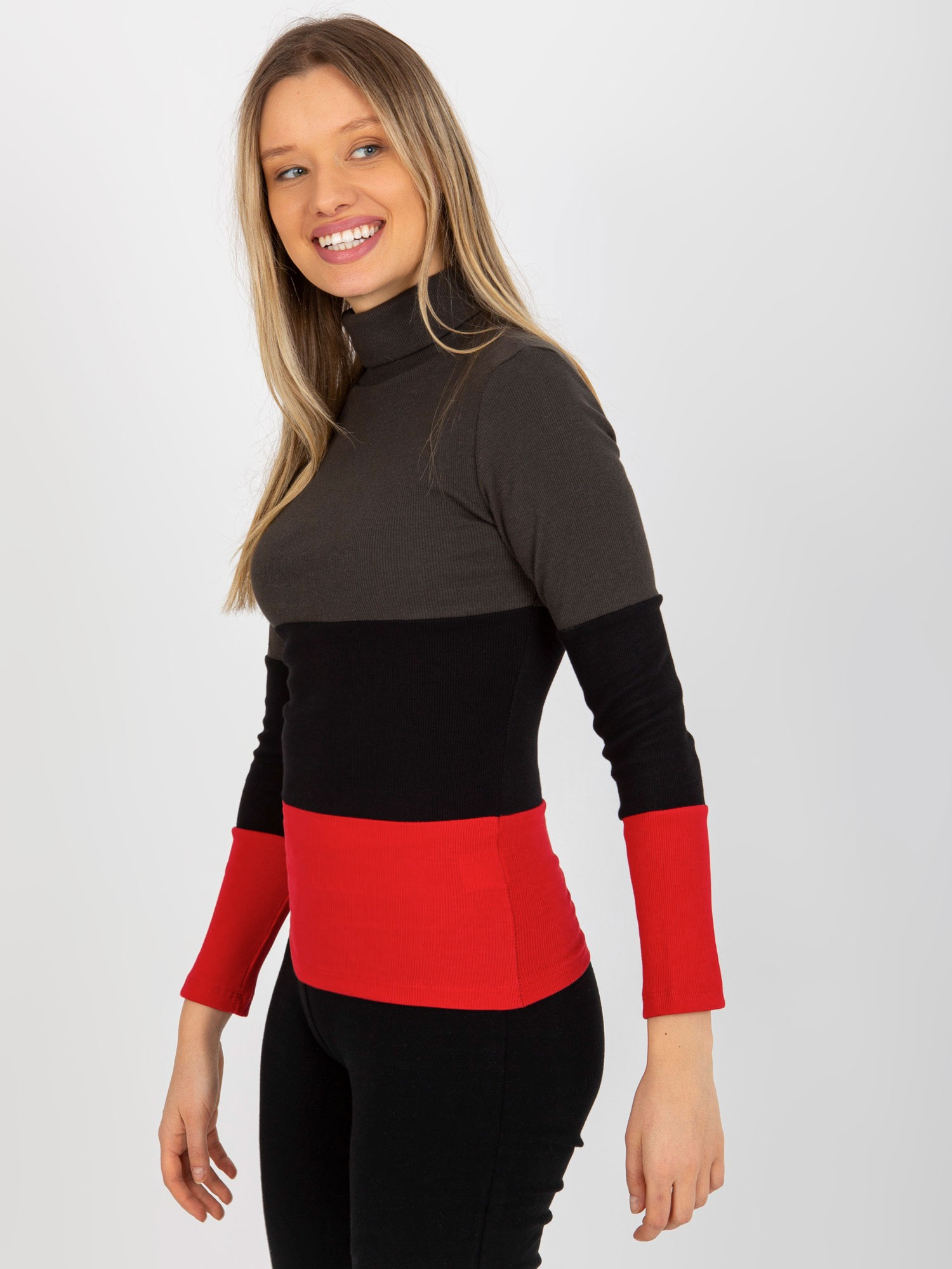 Khaki-czerwona prążkowana bluzka basic z golfem .