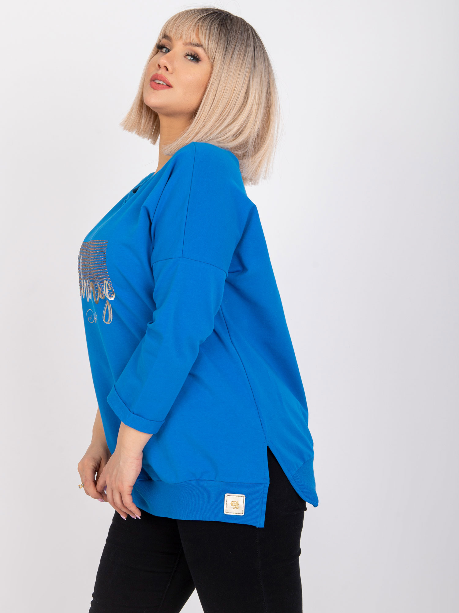 Wymiary bluzki w rozmiarze one size mierzone na płasko: szerokość pod pachami – 65 cm, długość całkowita – 71 cm, długość rękawa – 48 cm.