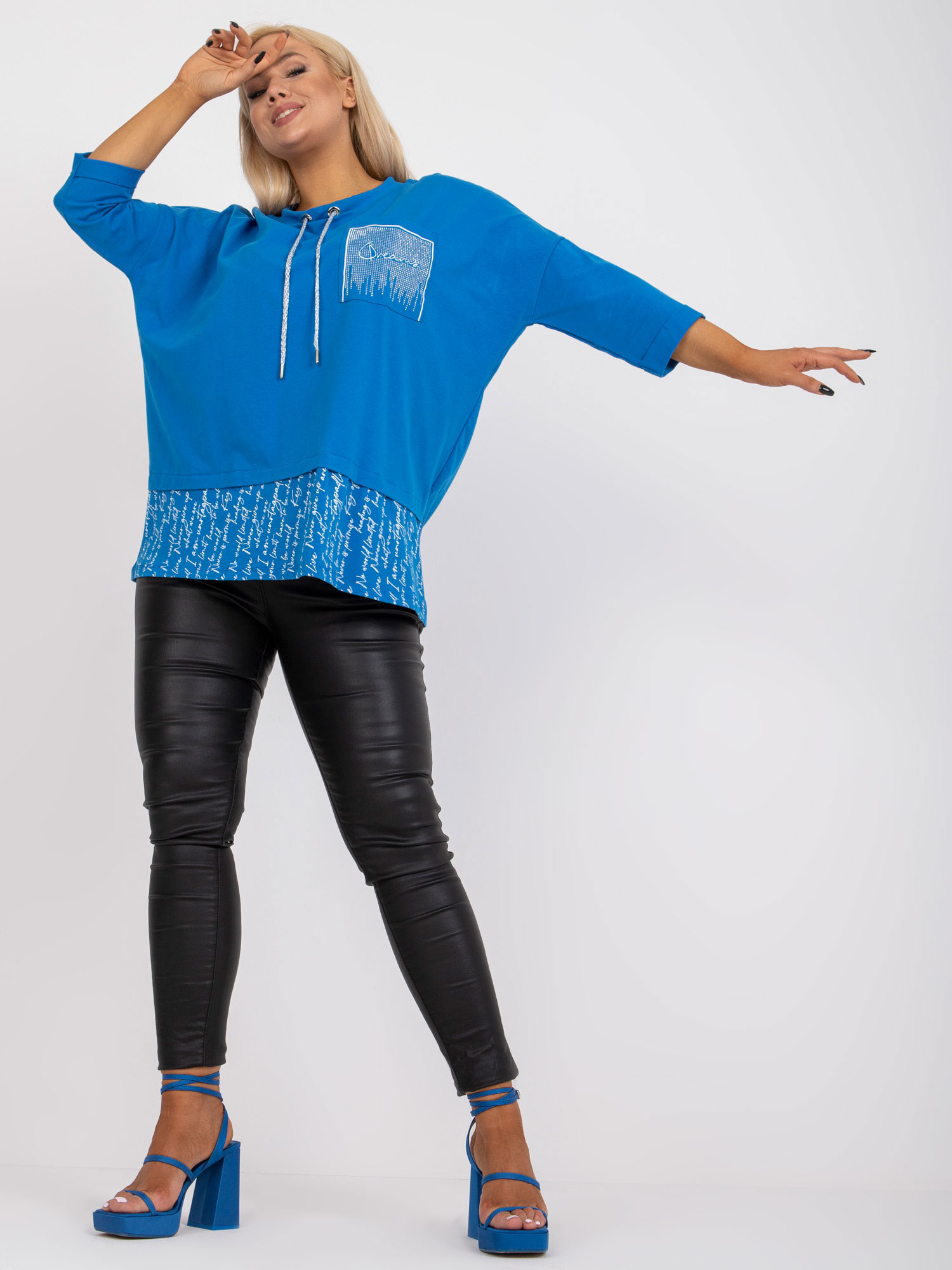Wymiary bluzki w rozmiarze one size mierzone na płasko: szerokość pod pachami – 71 cm, długość całkowita – 74 cm, długość rękawa – 44 cm.