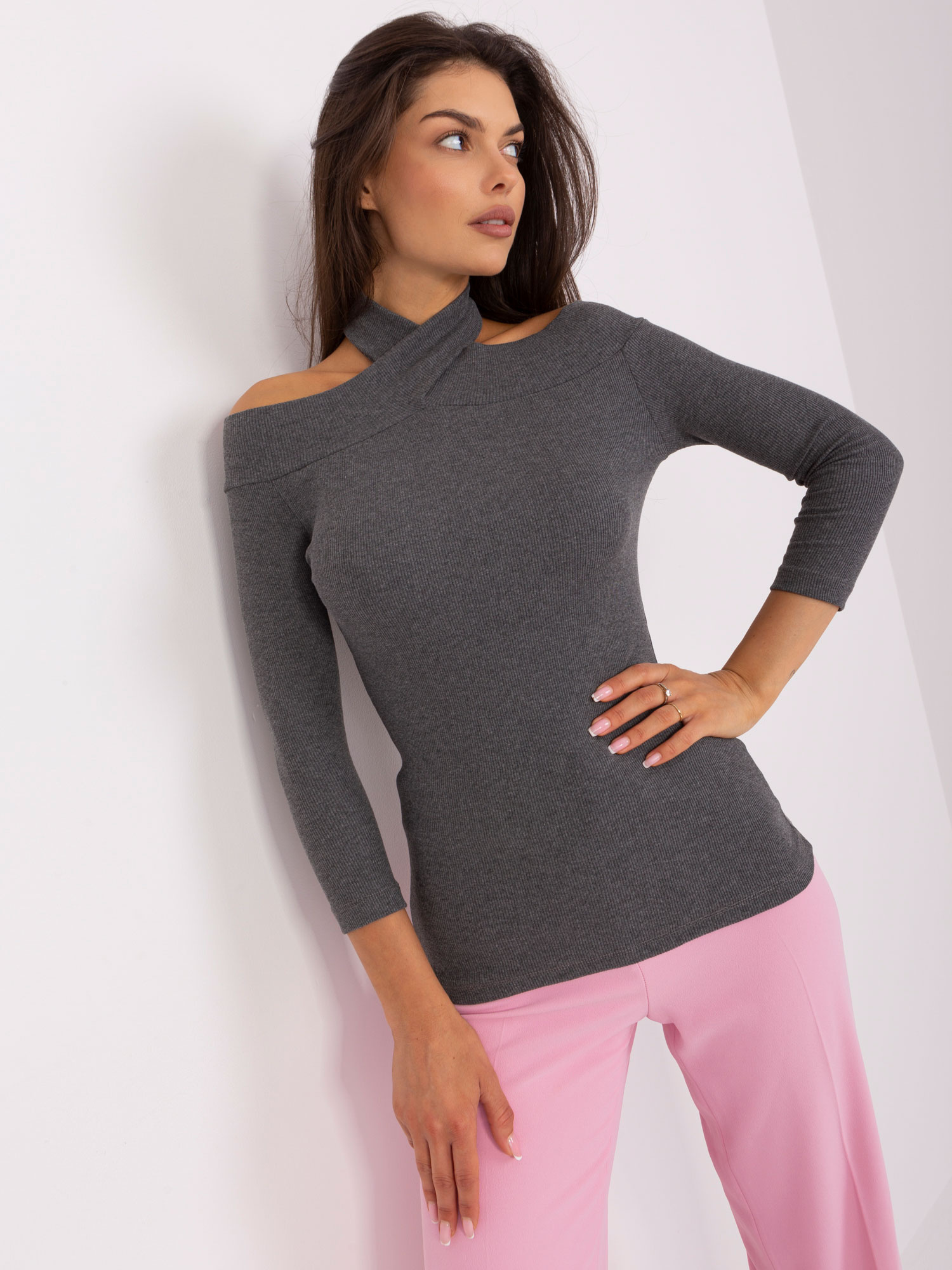 Ciemnoszara bluzka hiszpanka zakładana na szyję .
