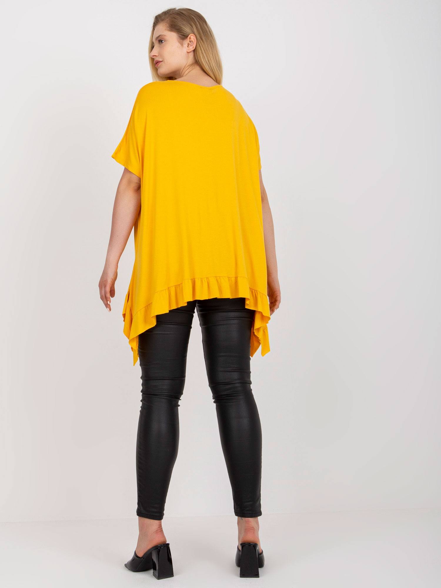 Wymiary bluzki w rozmiarze one size mierzone na płasko: szerokość pod pachami – 65 cm, długość całkowita – 72 cm.