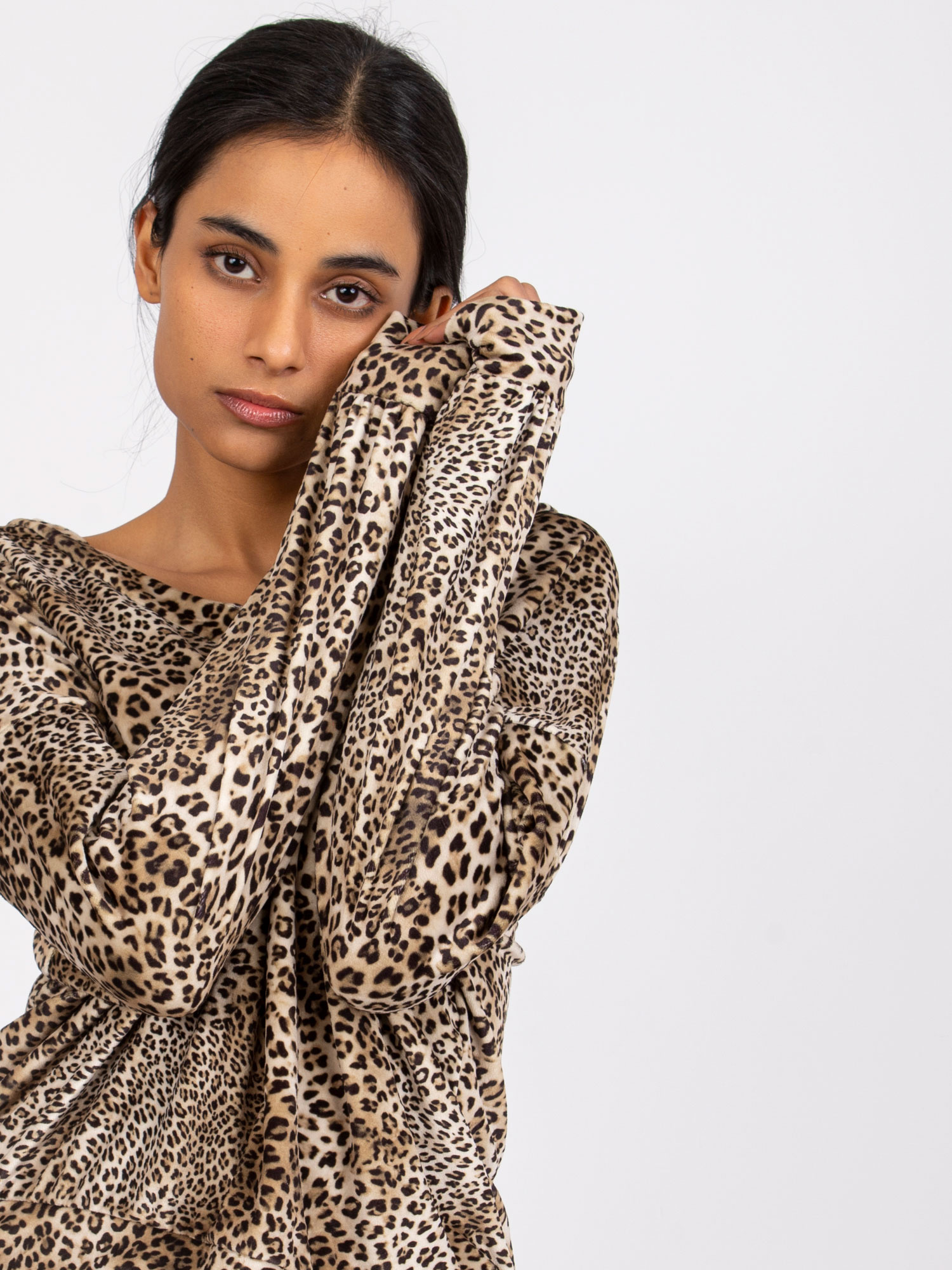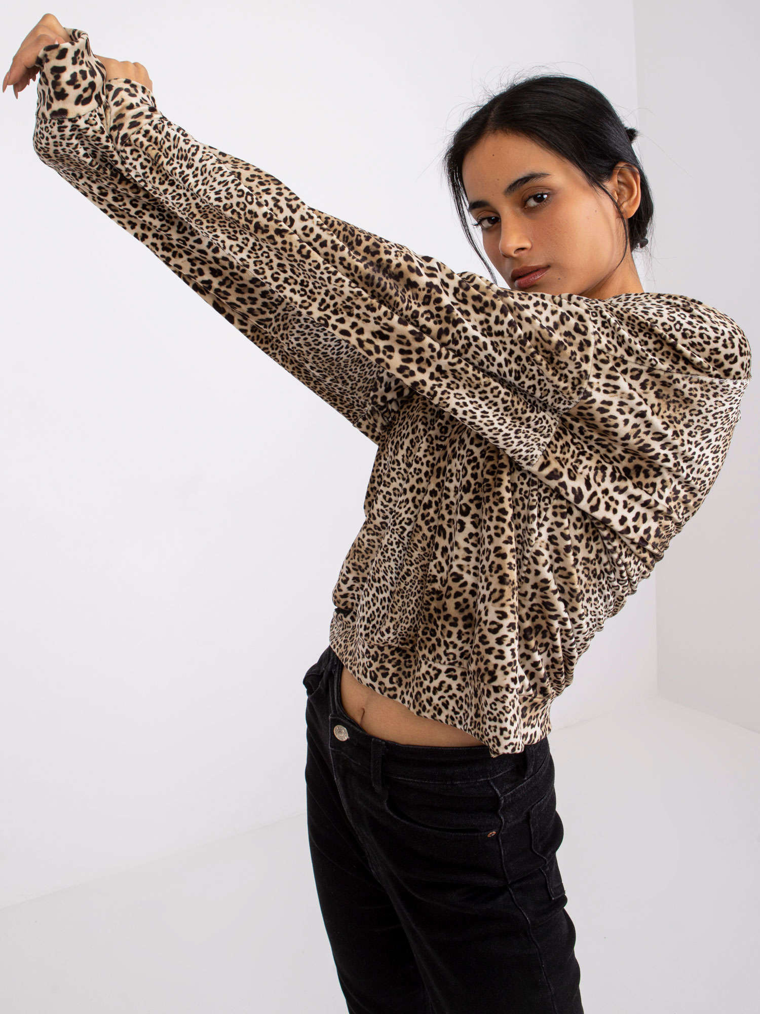 Wymiary bluzki w rozmiarze one size mierzone na płasko: szerokość pod pachami – 53 cm, długość całkowita – 59 cm, długość rękawa – 56 cm.