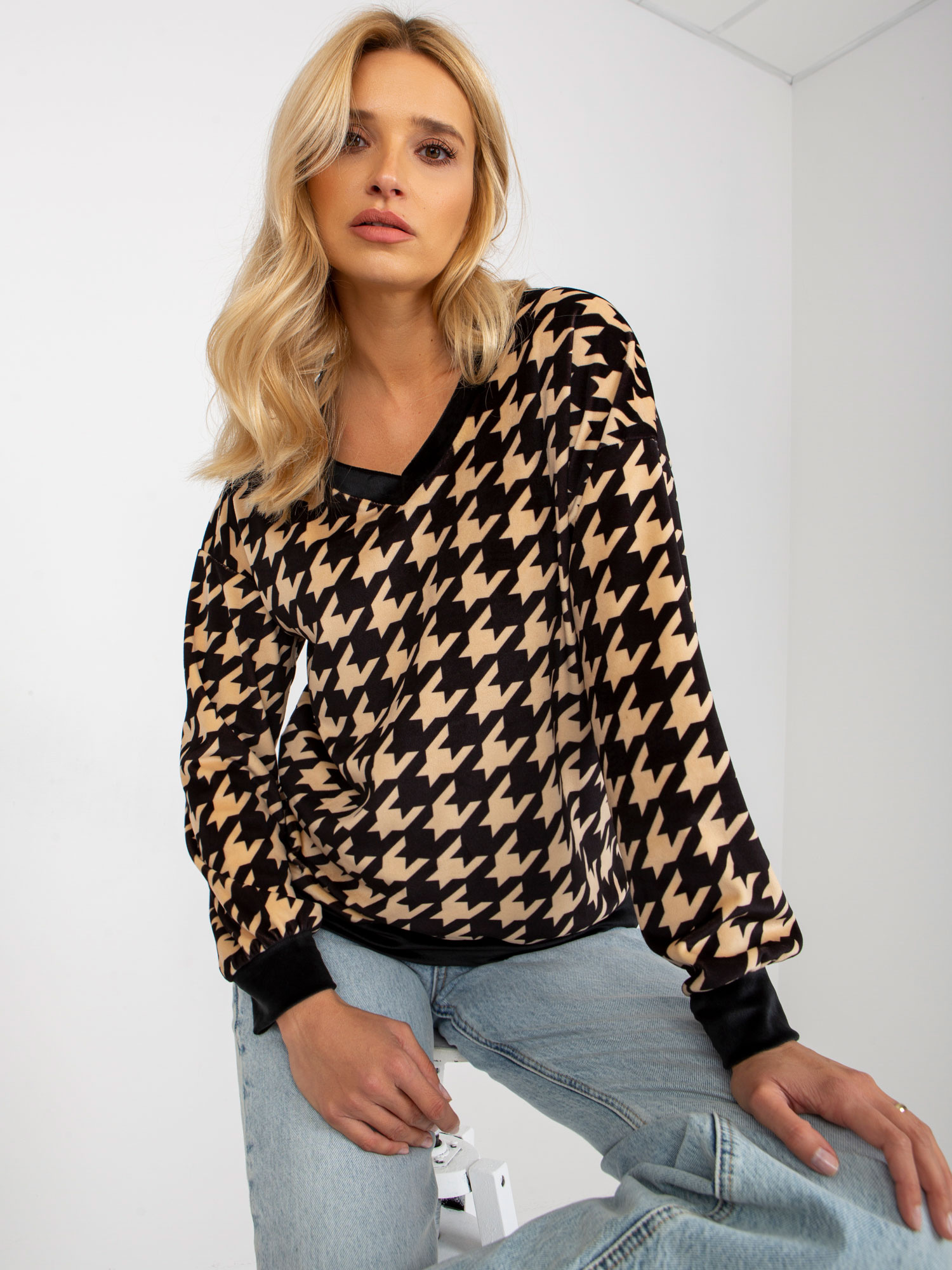 Beżowo-czarna bluzka welurowa z nadrukiem RUE PARIS .