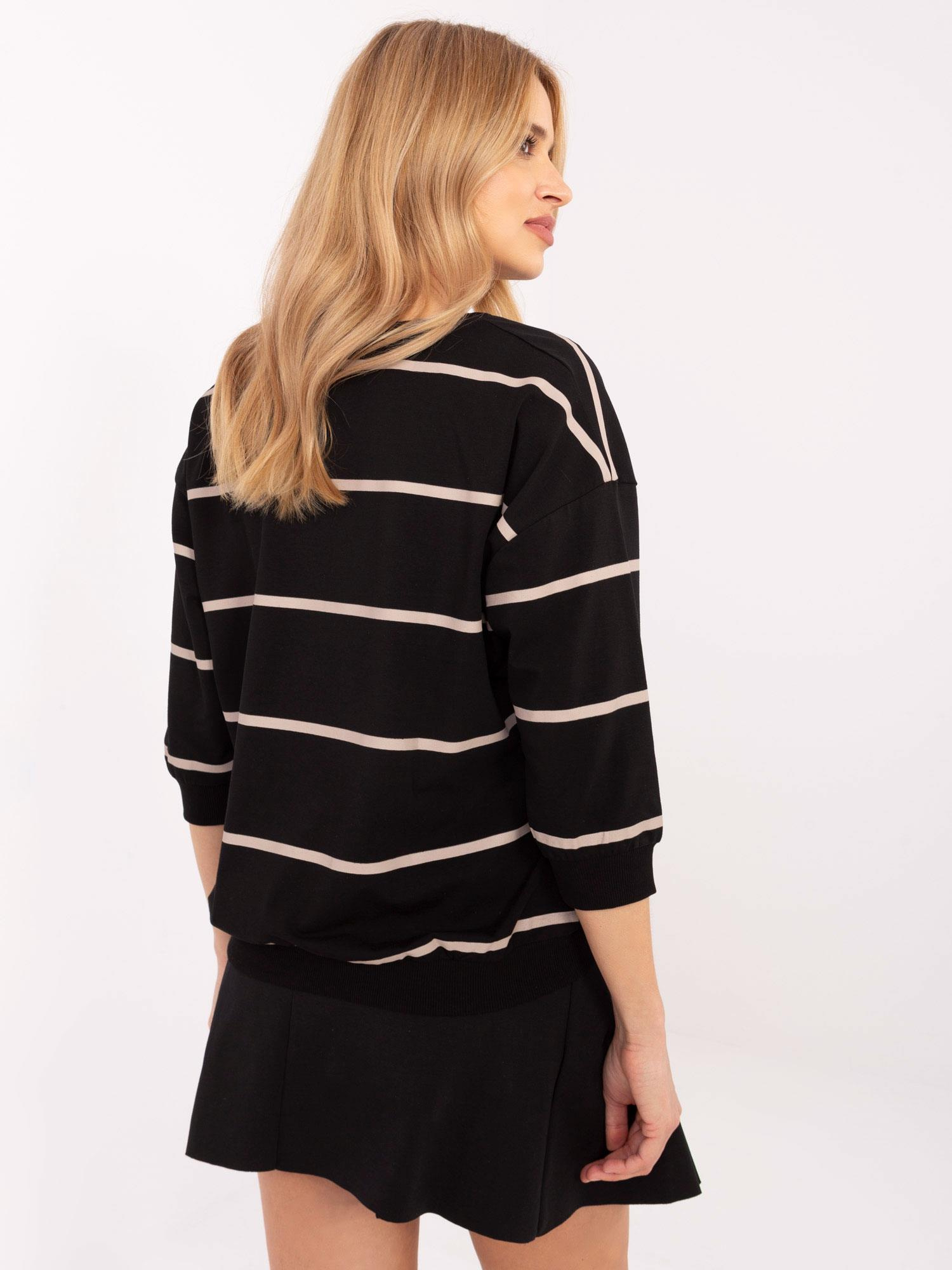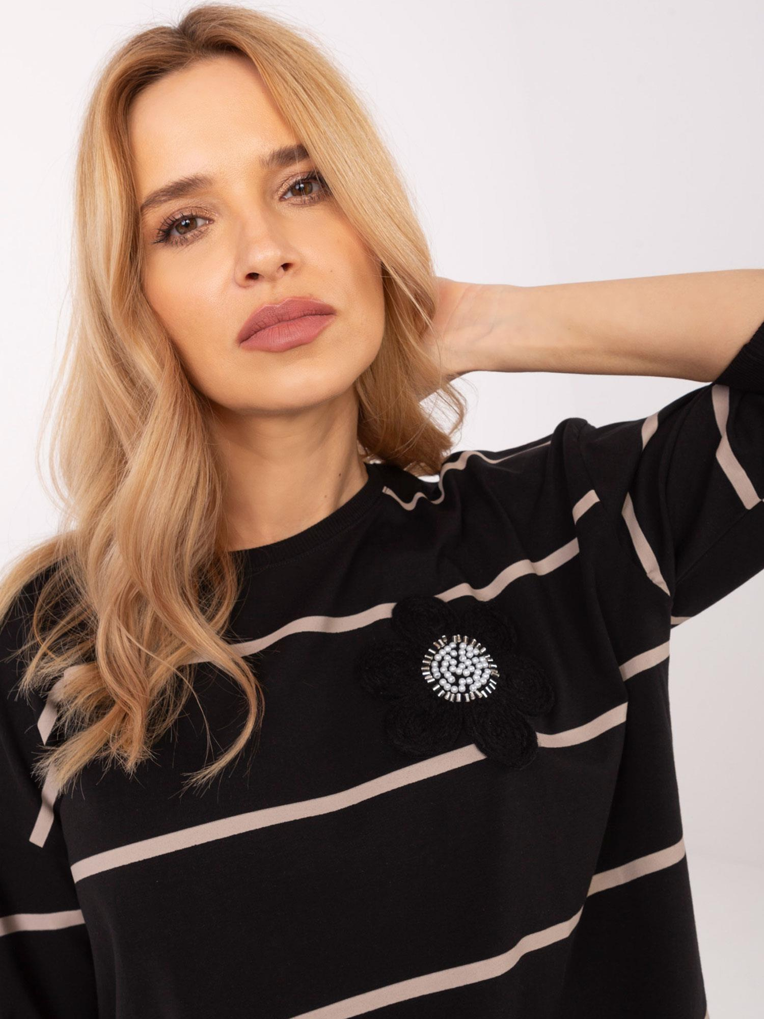 Wymiary bluzki w rozmiarze one size mierzone na płasko: szerokość pod pachami – 58 cm, długość rękawa – 34 cm (od szwu), długość całkowita – 62 cm, szerokość w biodrach – 48 cm (na płasko).