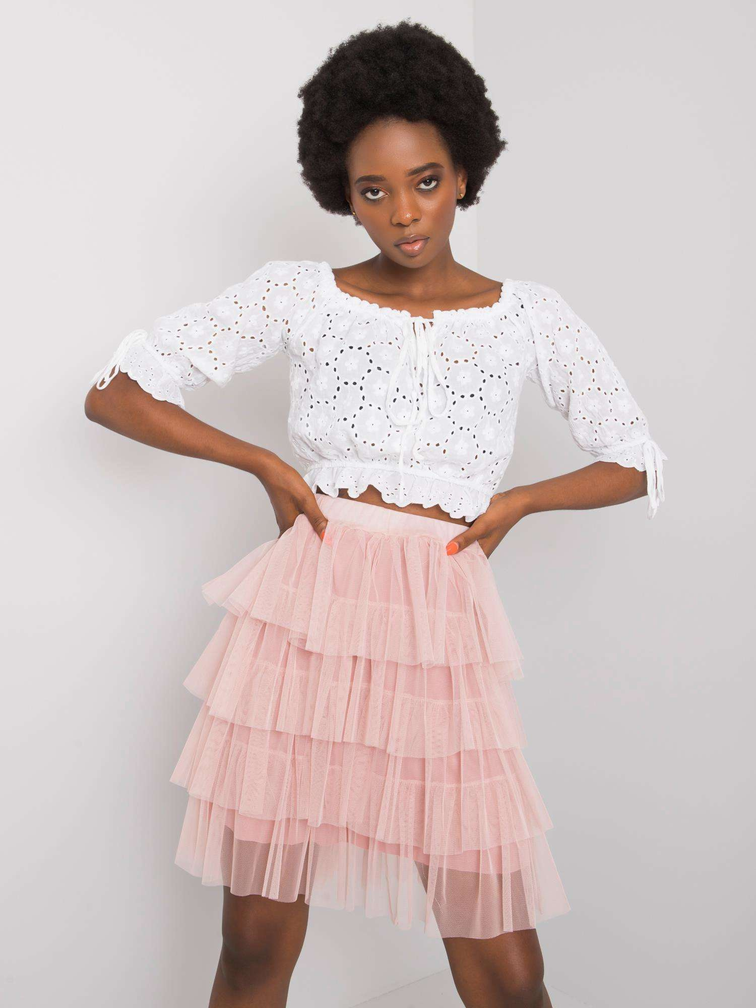 Modelka ma na sobie rozmiar S. Wymiary modelki: wzrost 172 cm, biust 89 cm, talia 65 cm, biodra 93 cm.