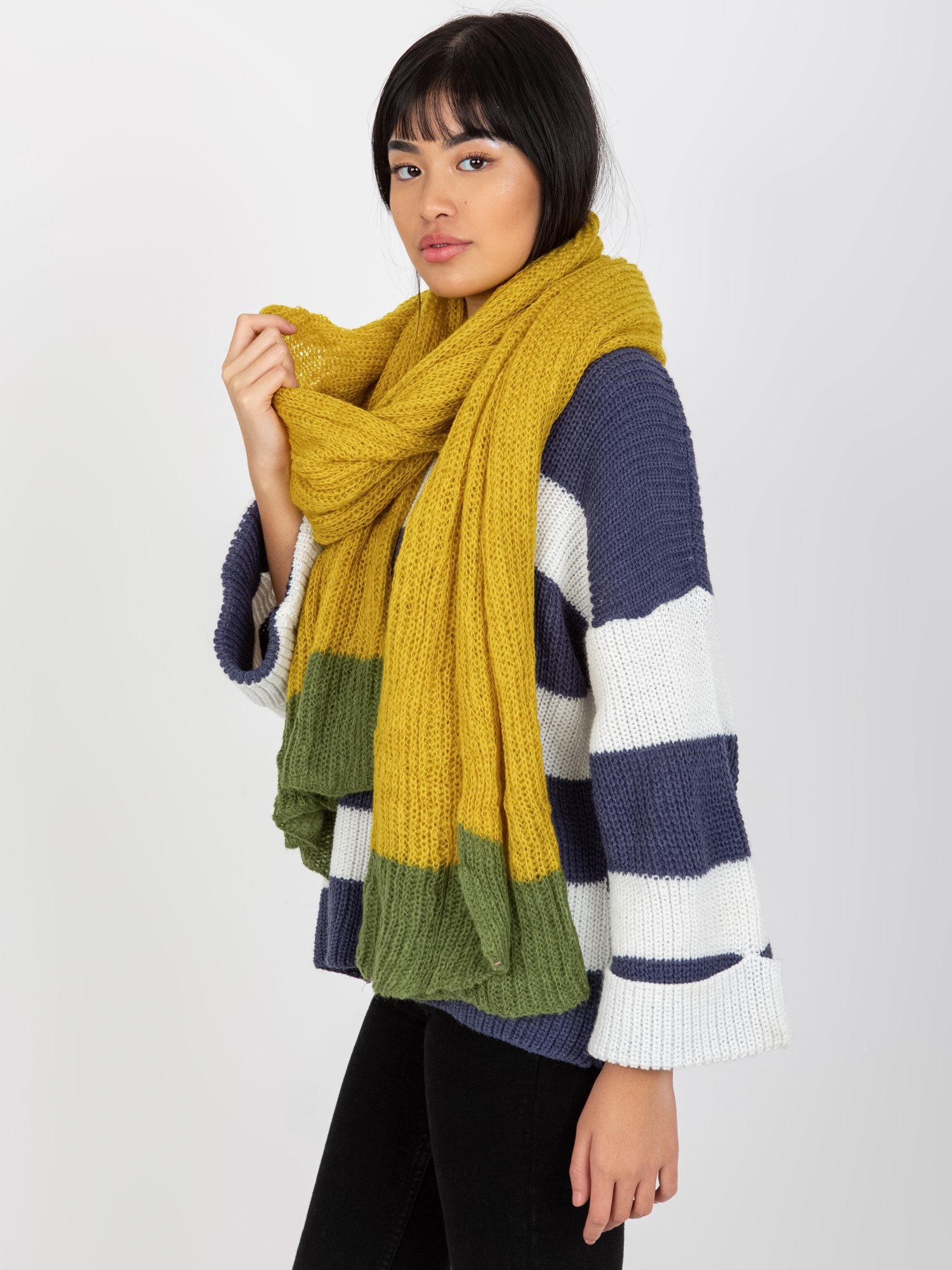 Modelka ma na sobie rozmiar one size. Wymiary modelki: wzrost 176 cm, biust 104 cm, talia 87 cm, biodra 119 cm.