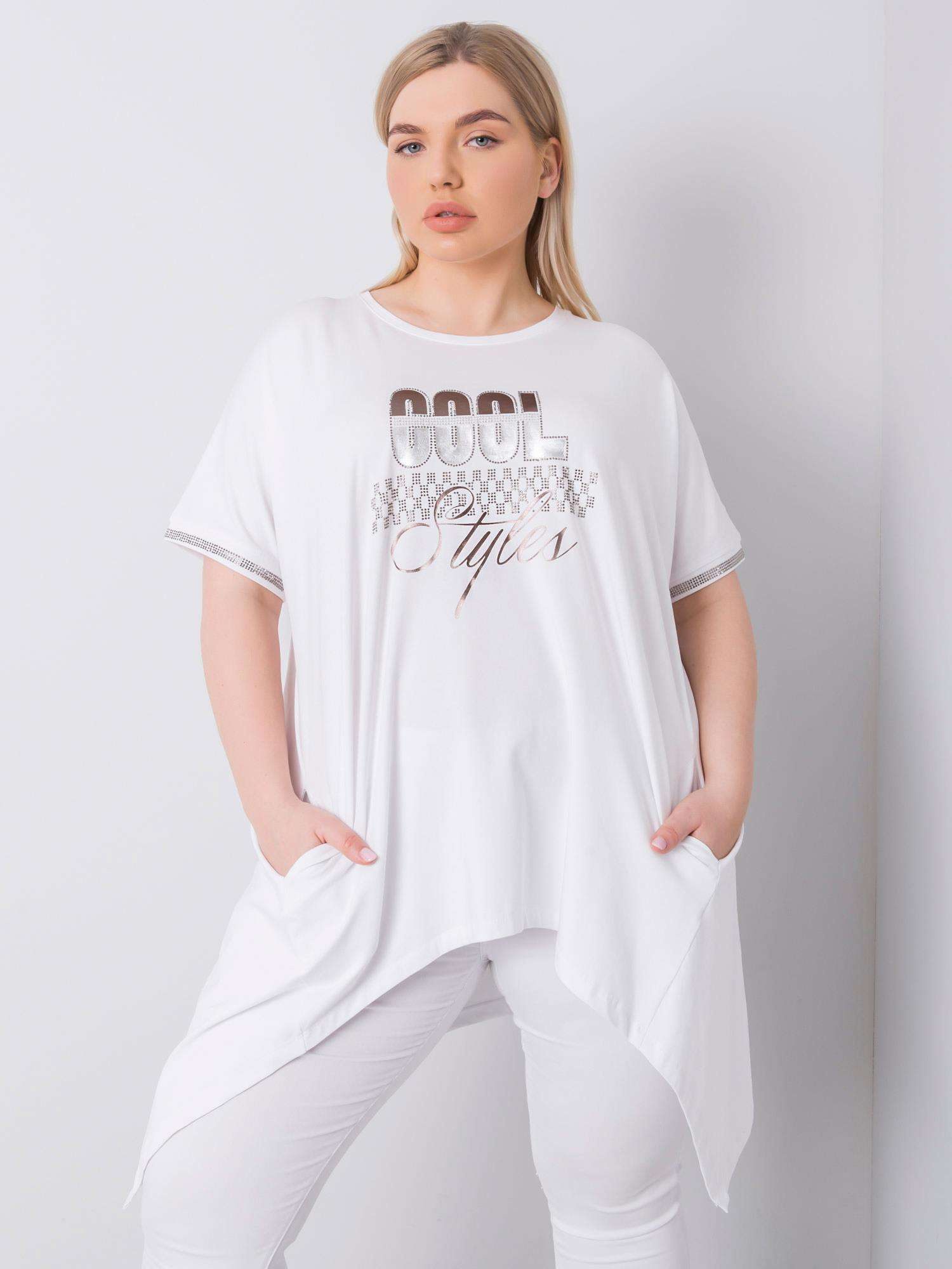 Wymiary bluzki w rozmiarze one size mierzone na płasko: szerokość pod pachami – 65 cm, długość rękawa – 40 cm, długość całkowita – 70 cm..