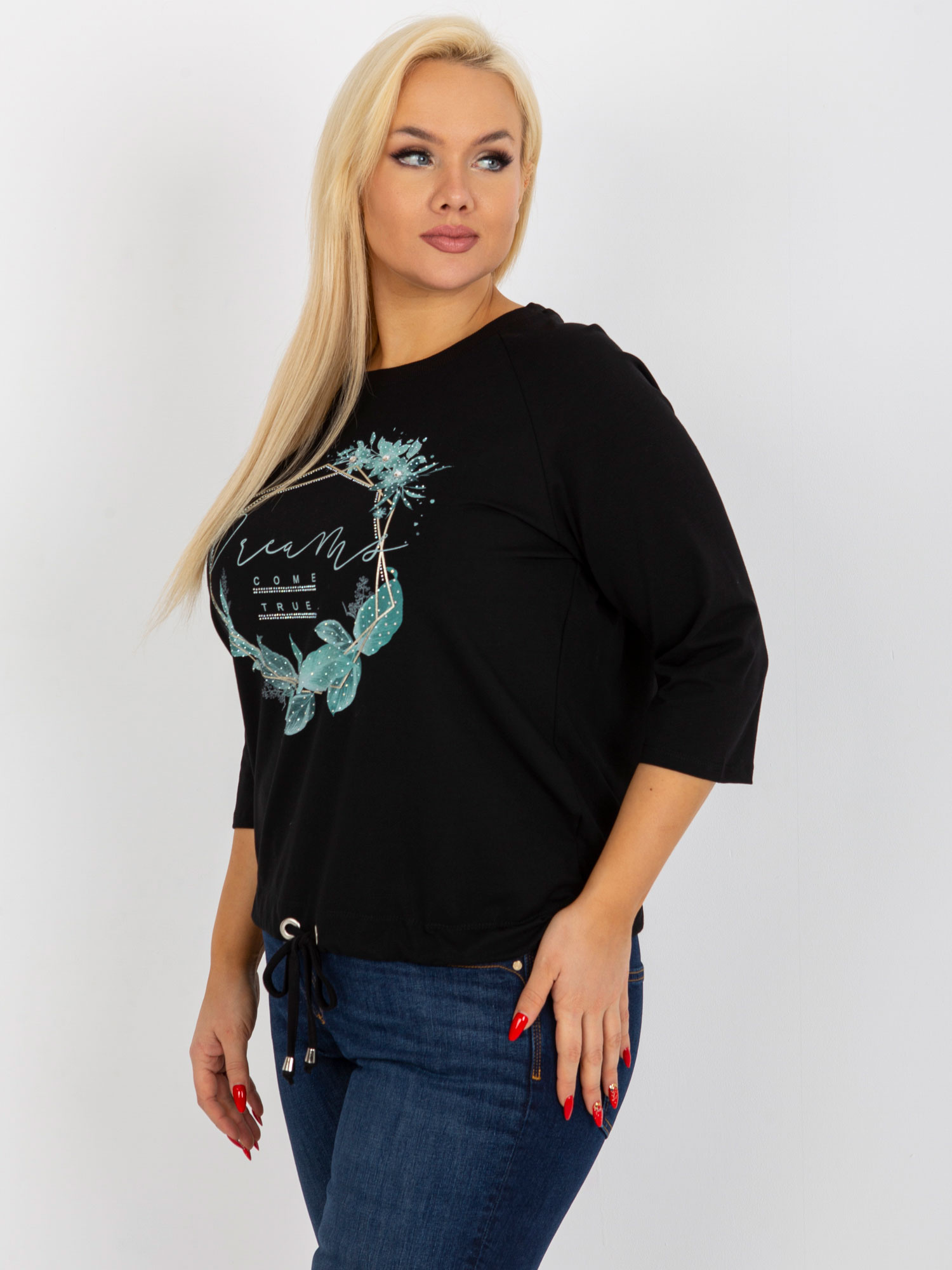 Czarna bluzka plus size z nadrukiem i dżetami .