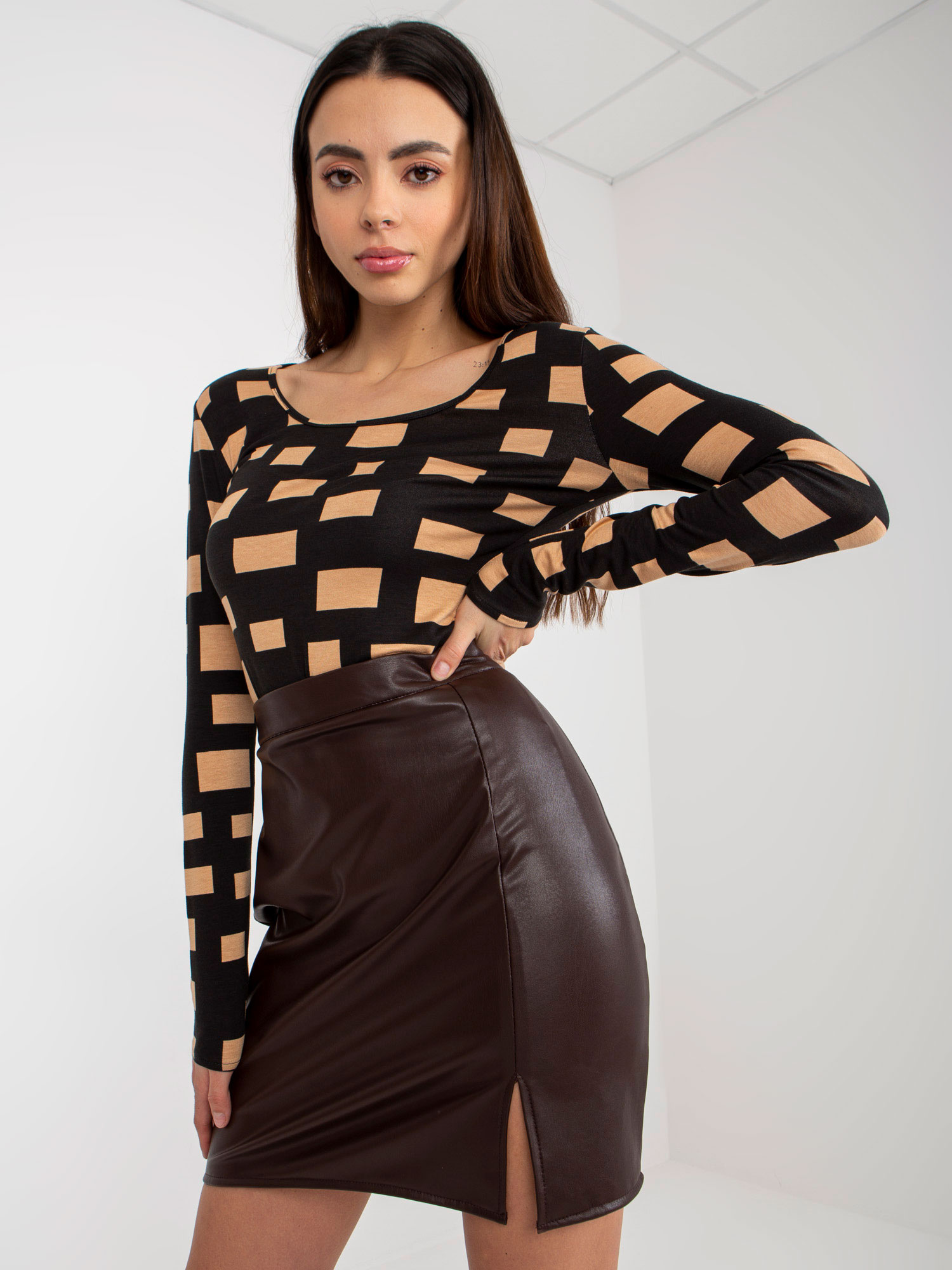 Czarno-camelowa dopasowana bluzka z nadrukiem .
