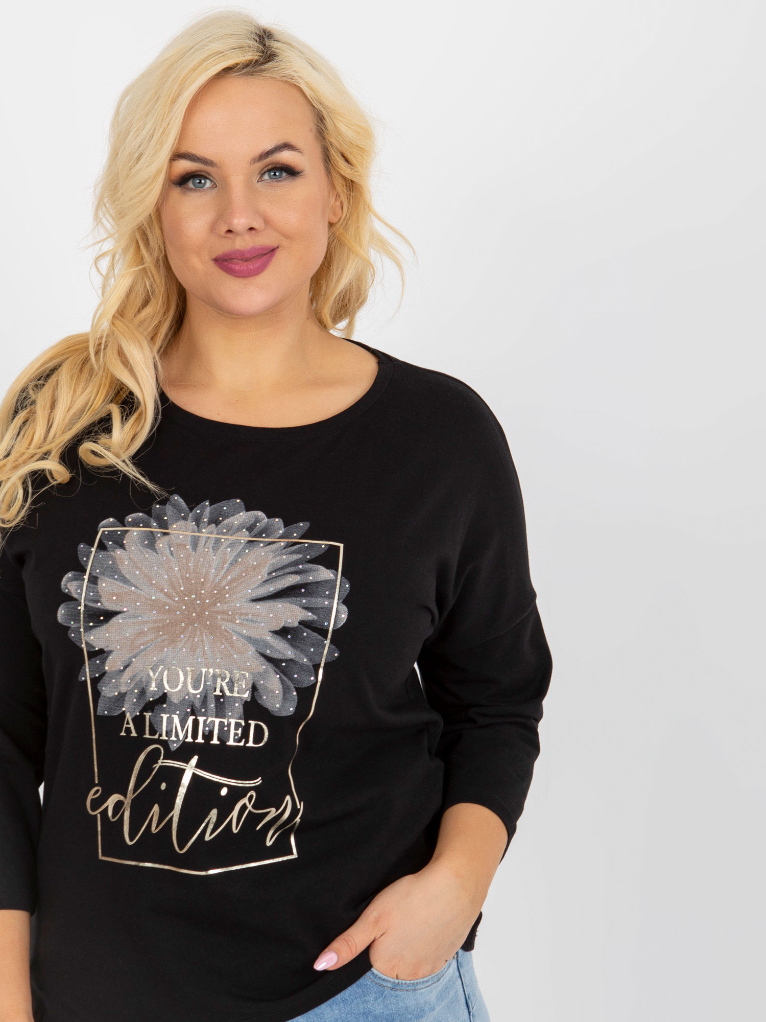 Czarna damska bluzka plus size z napisem i dżetami .