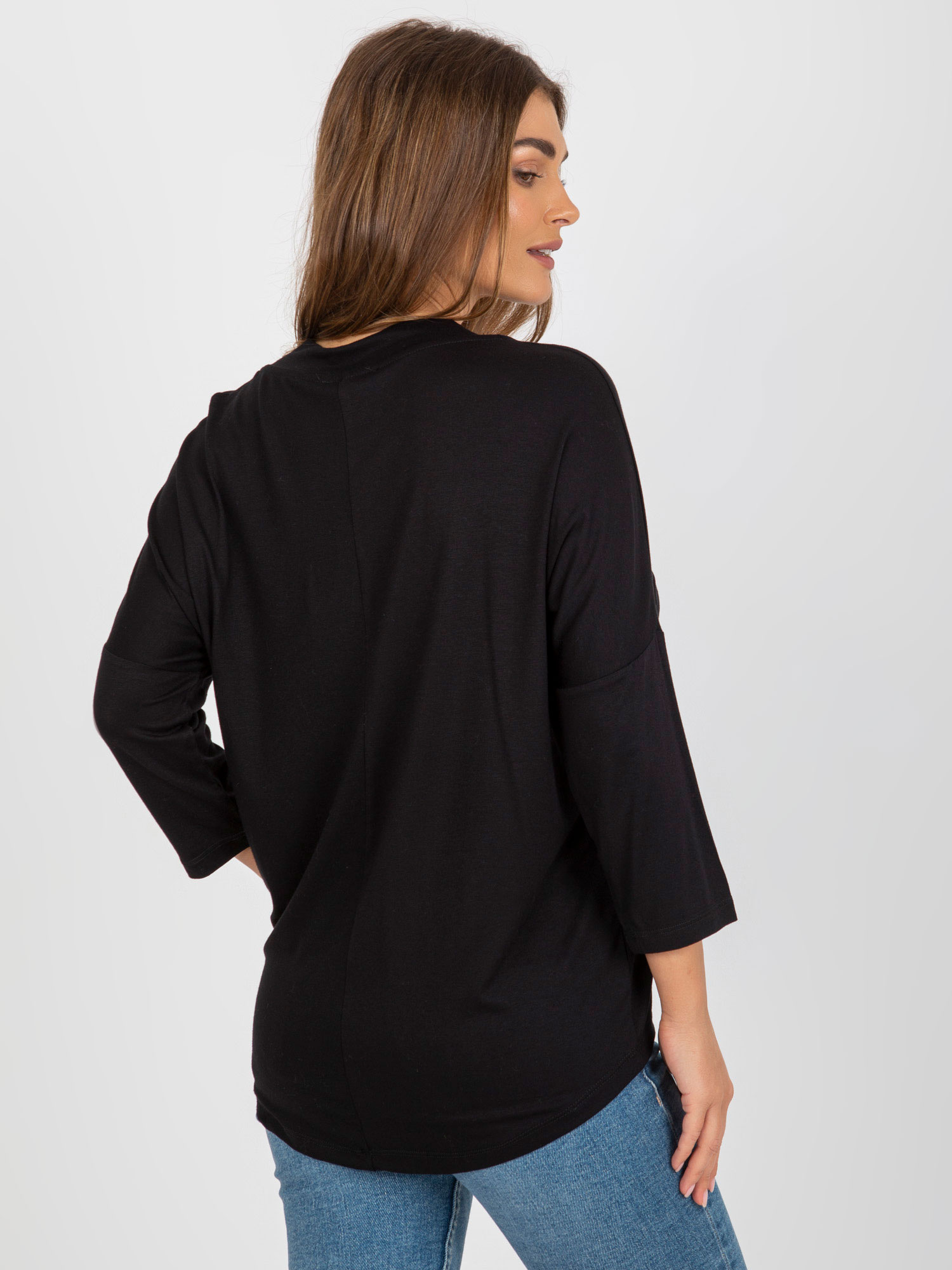 Wymiary bluzki w rozmiarze one size mierzone na płasko: szerokość pod pachami – 65 cm, długość rękawa – 45 cm, długość całkowita (przód) – 59 cm, długość całkowita (tył) – 68 cm.