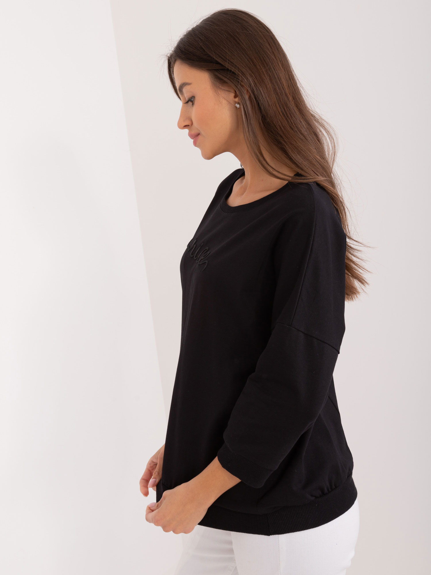 Wymiary bluzki w rozmiarze one size mierzone na płasko: szerokość pod pachami – 60 cm, długość rękawa – 42 cm, długość całkowita – 57 cm.
