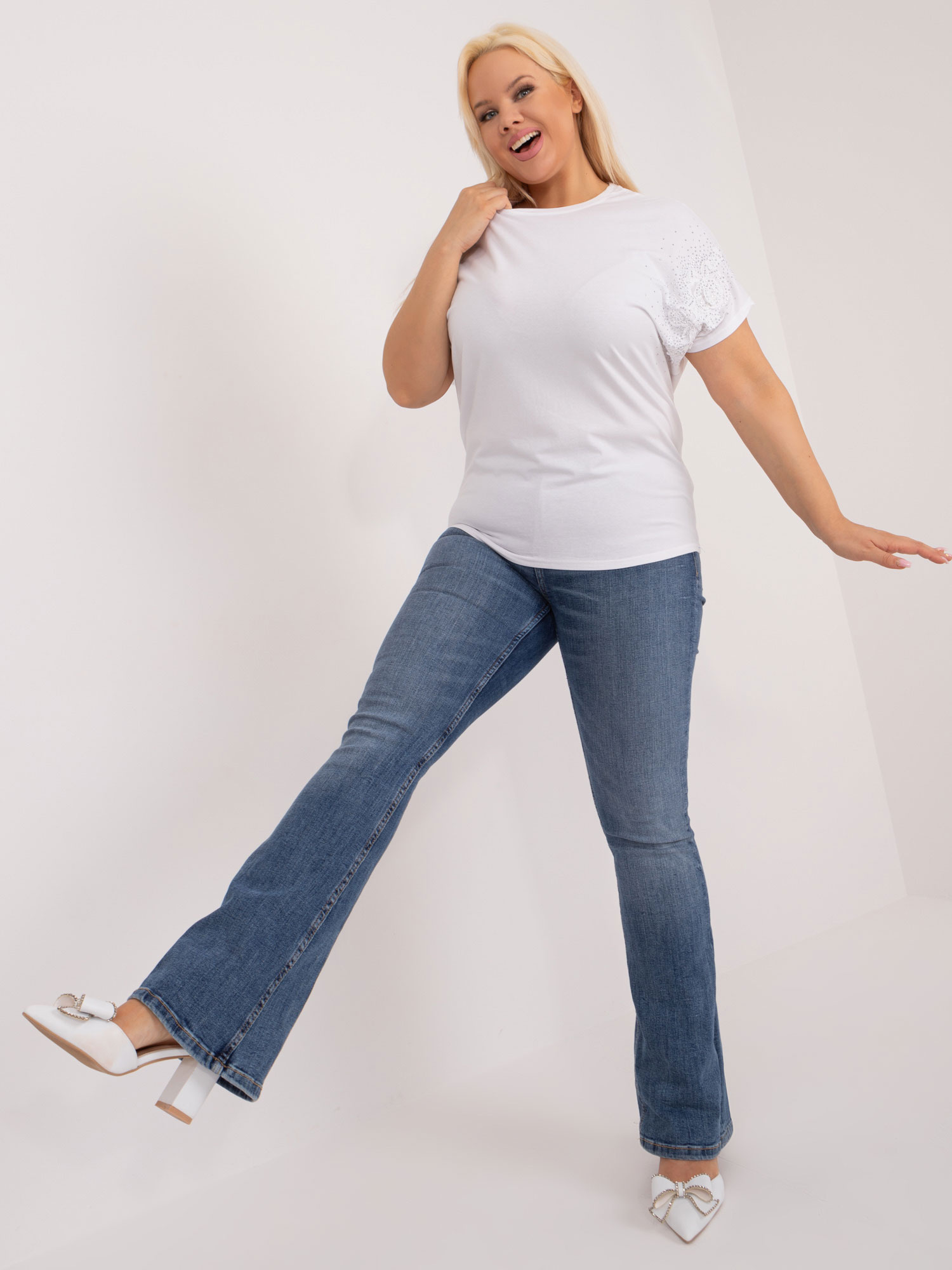 Wymiary bluzki w rozmiarze one size mierzone na płasko: szerokość pod pachami – 75 cm, długość całkowita (przód) – 67 cm, długość całkowita (tył) – 77 cm, długość rękawa – 43 cm.