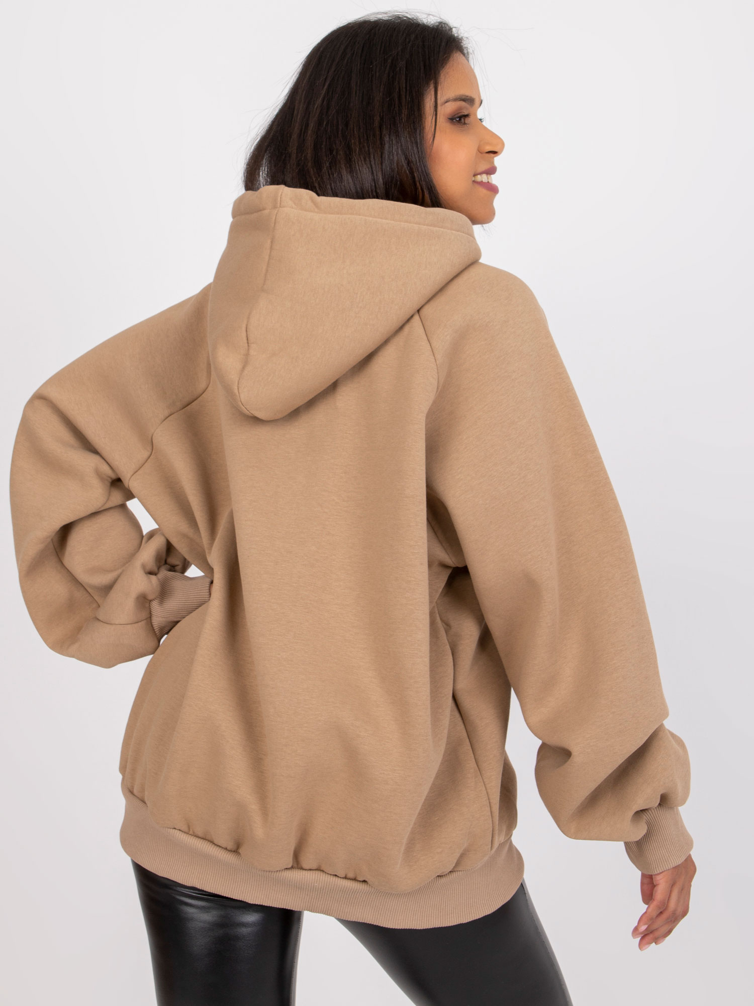 Wymiary bluzki w rozmiarze one size mierzone na płasko: szerokość pod pachami – 70 cm, długość całkowita (przód) – 69 cm, długość całkowita (tył) – 75 cm .