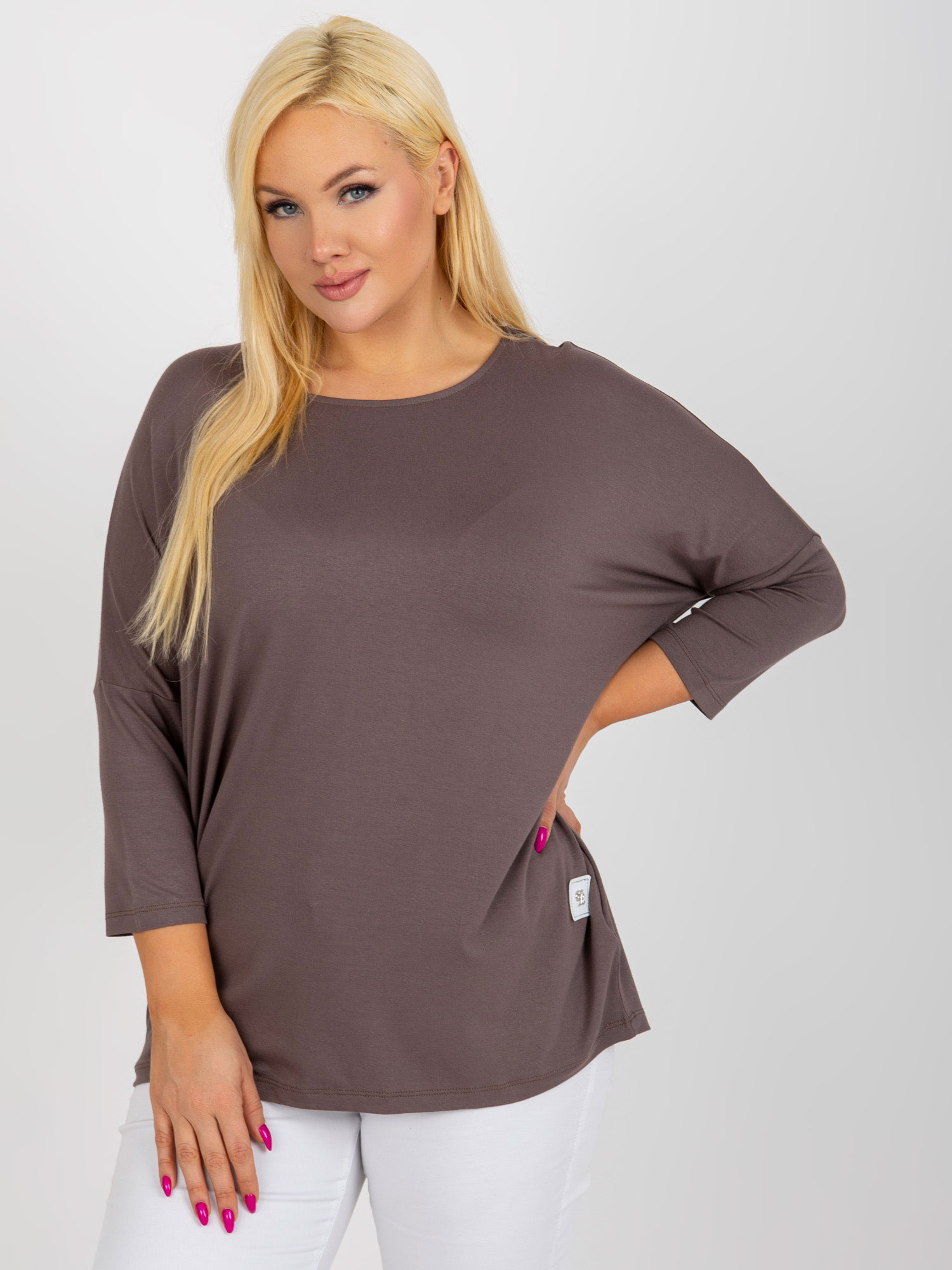 Wymiary bluzki w rozmiarze one size mierzone na płasko: szerokość pod pachami – 46 cm, długość rękawa – 51 cm, długość całkowita – 58 cm.