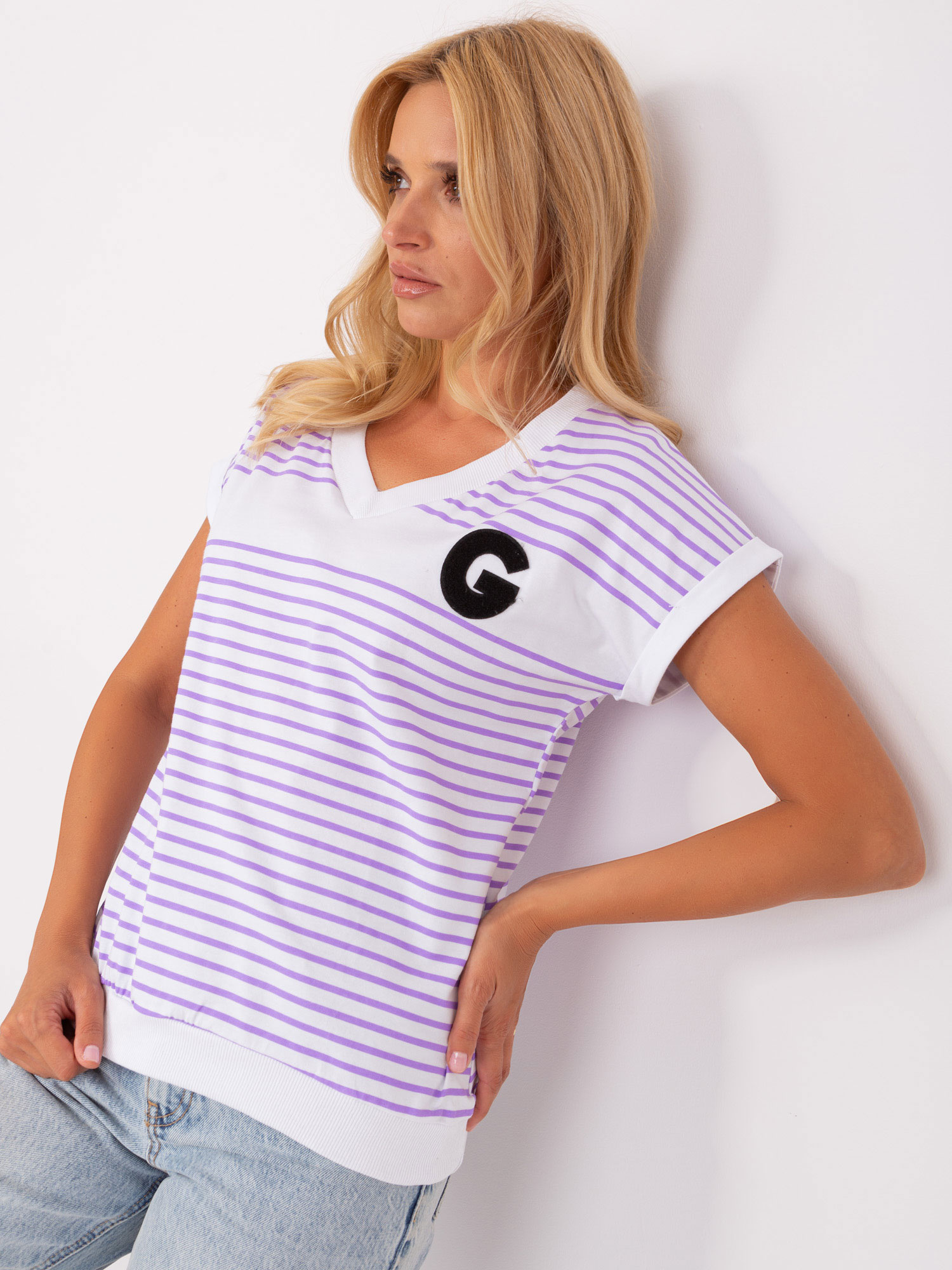 Biało-fioletowa bluzka w paski z dekoltem V .