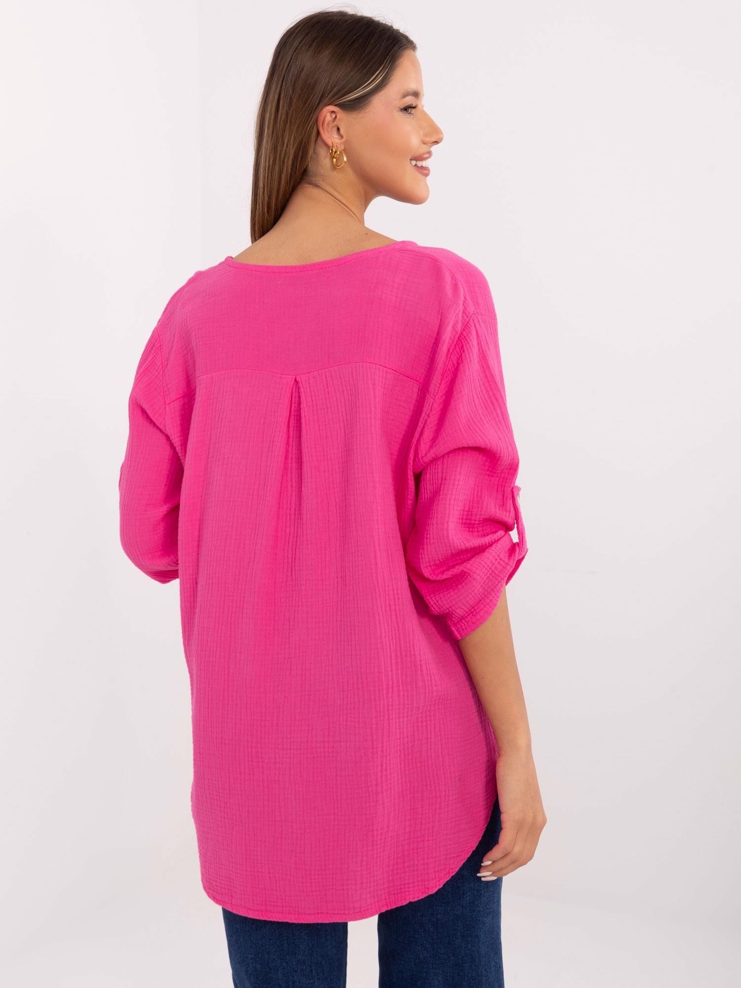 Wymiary bluzki w rozmiarze one size mierzone na płasko: szerokość pod pachami – 62 cm, długość rękawa – 45 cm (od szwu), szerokość w biodrach – 67 cm, długość całkowita – 69 cm (przód, długość całkowita – 80 cm (tył)).