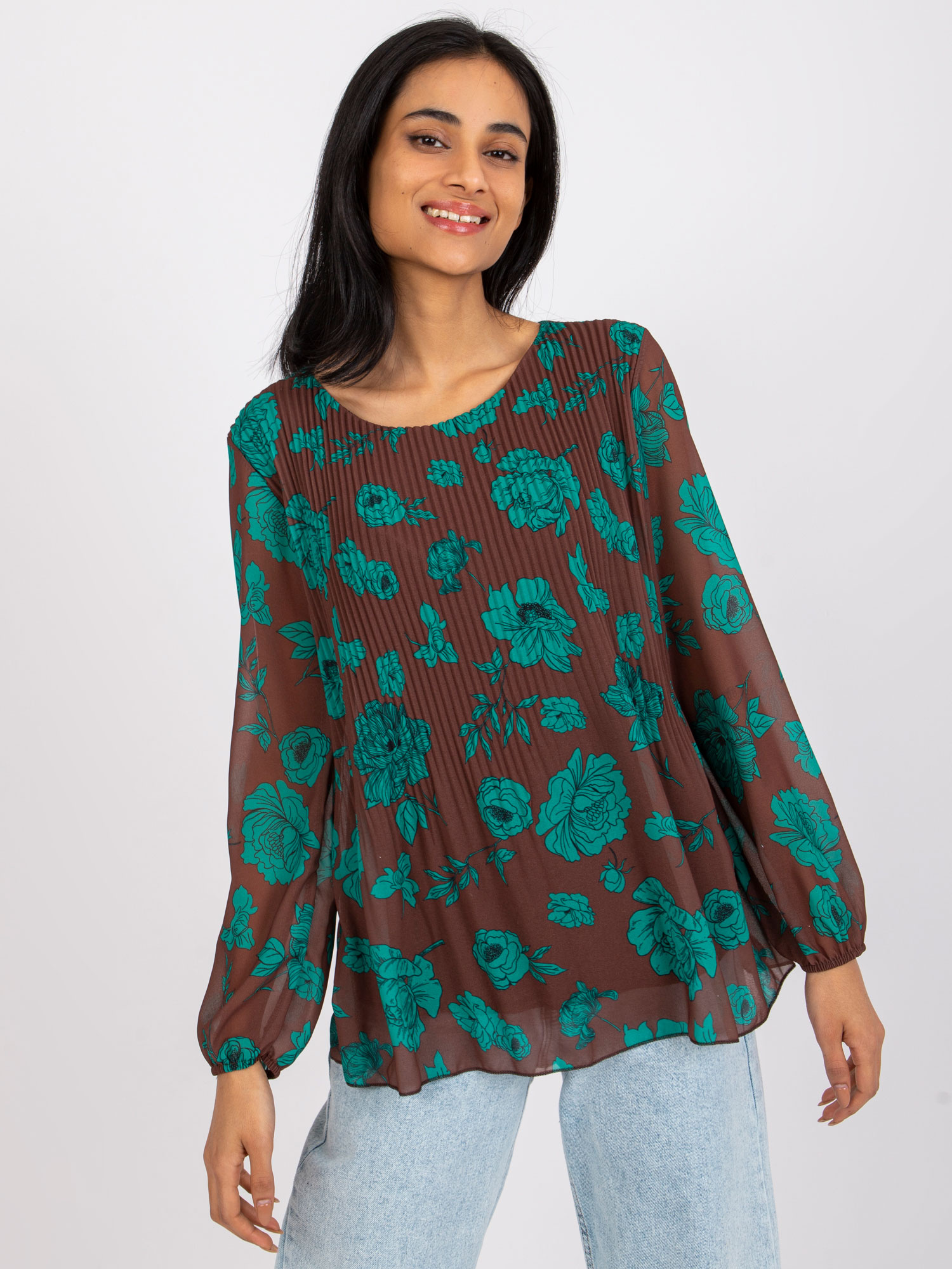 Wymiary bluzki w rozmiarze S mierzone na płasko: szerokość pod pachami – 50 cm, długość rękawa – 58 cm, długość całkowita (przód) – 63 cm, długość całkowita (tył) – 70 cm .
