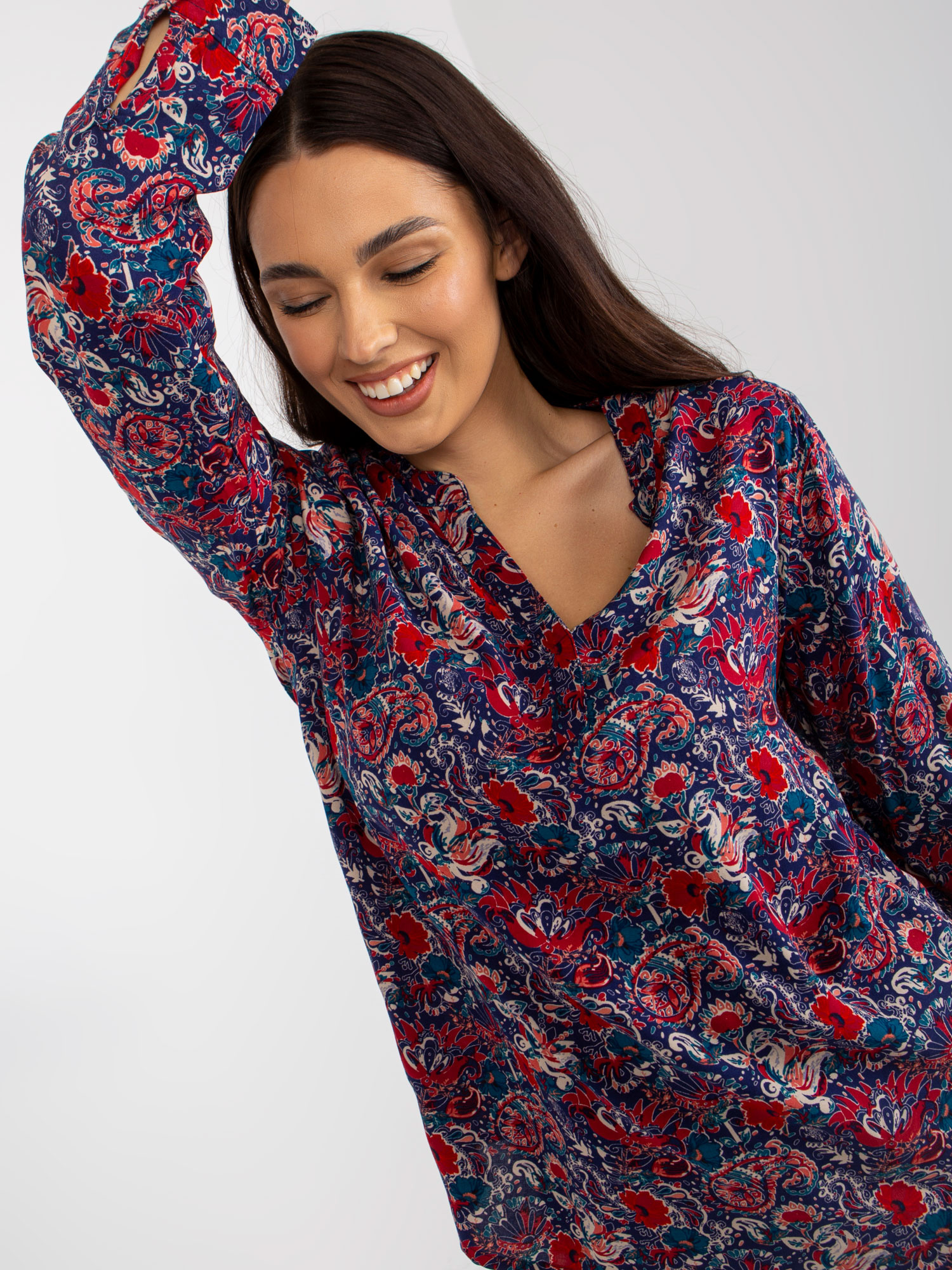 Granatowo-czerwona bluzka z nadrukiem i dekoltem V SUBLEVEL .