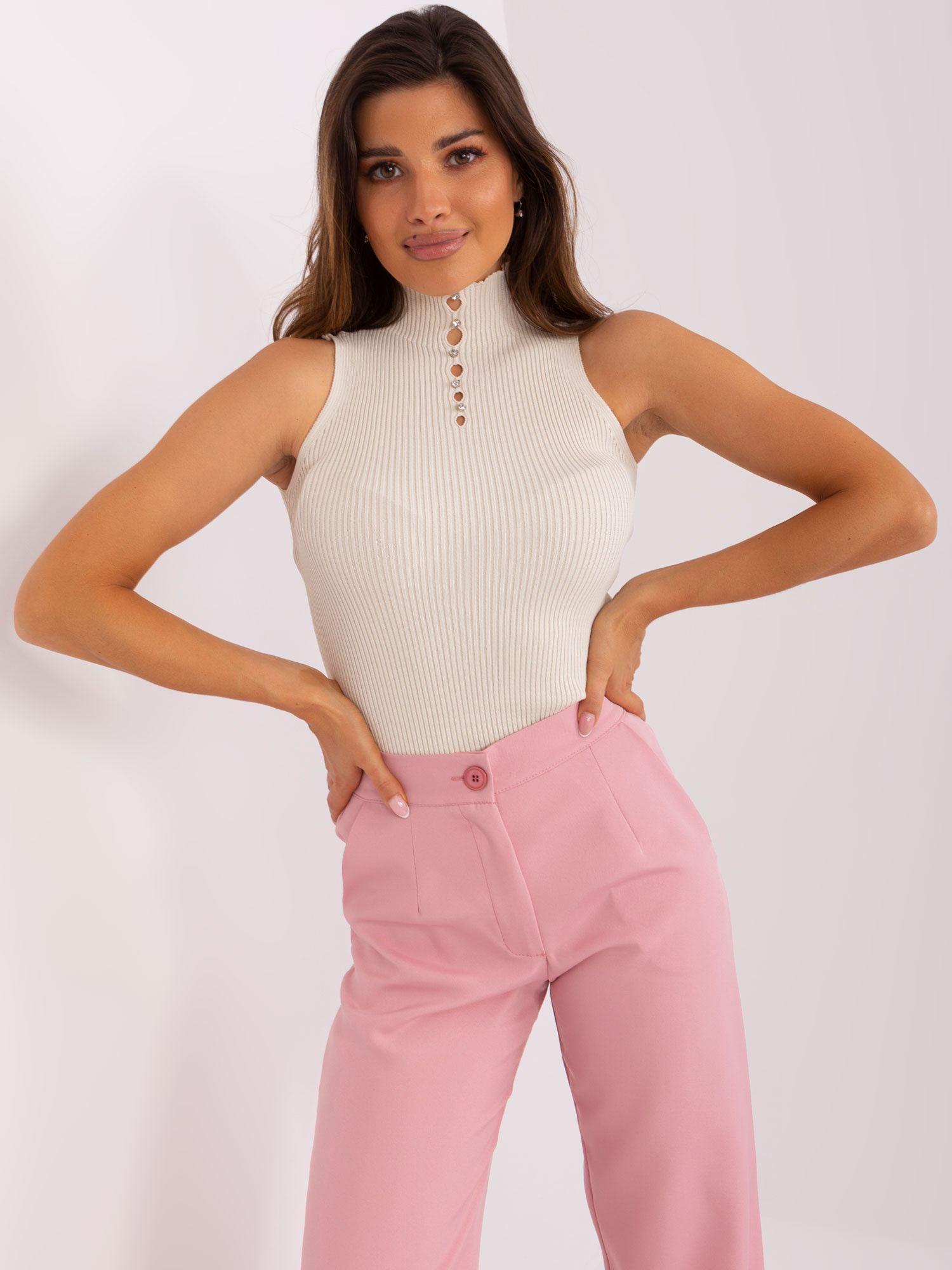 Jasnobeżowa bluzka z golfem bez rękawów .