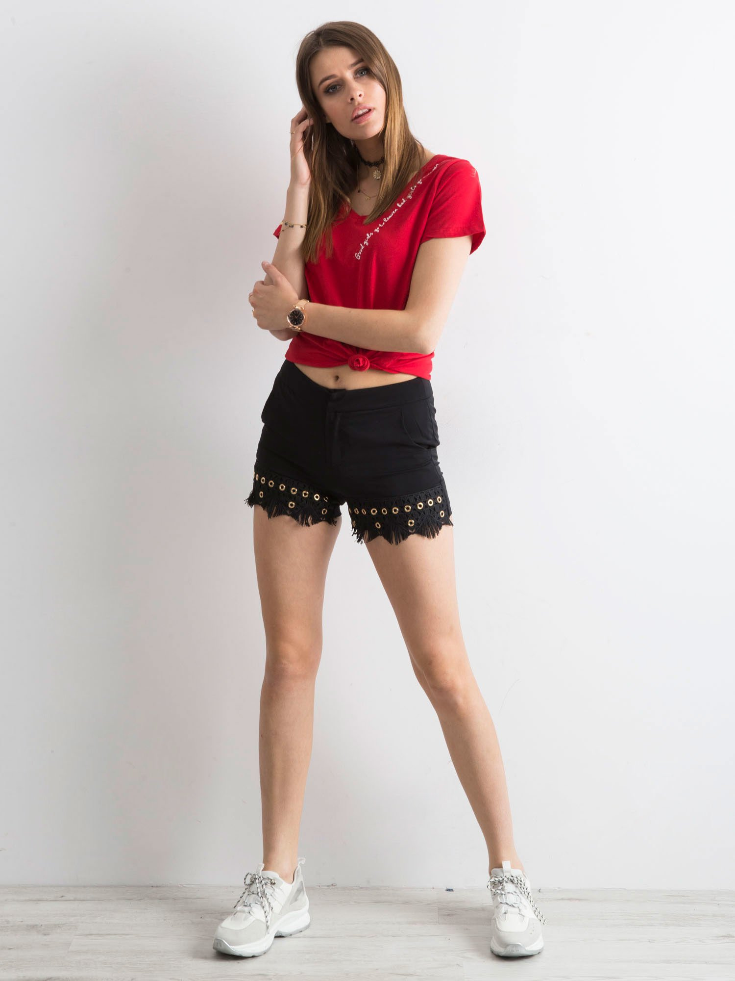Modelka ma na sobie rozmiar S. Wymiary modelki: wzrost 175 cm, biust 90 cm, talia 66 cm, biodra 94 cm.