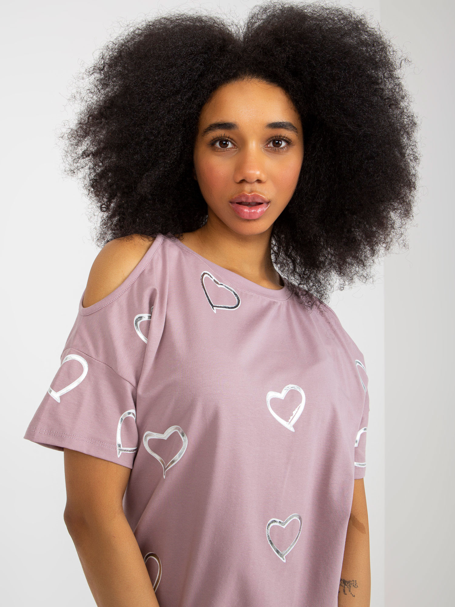 Jasnofioletowa damska bluzka z błyszczącym nadrukiem .