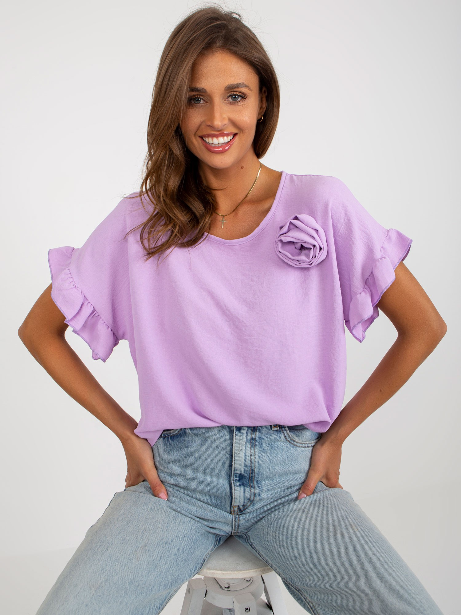 Jasnofioletowa bluzka oversize z krótkim rękawem .