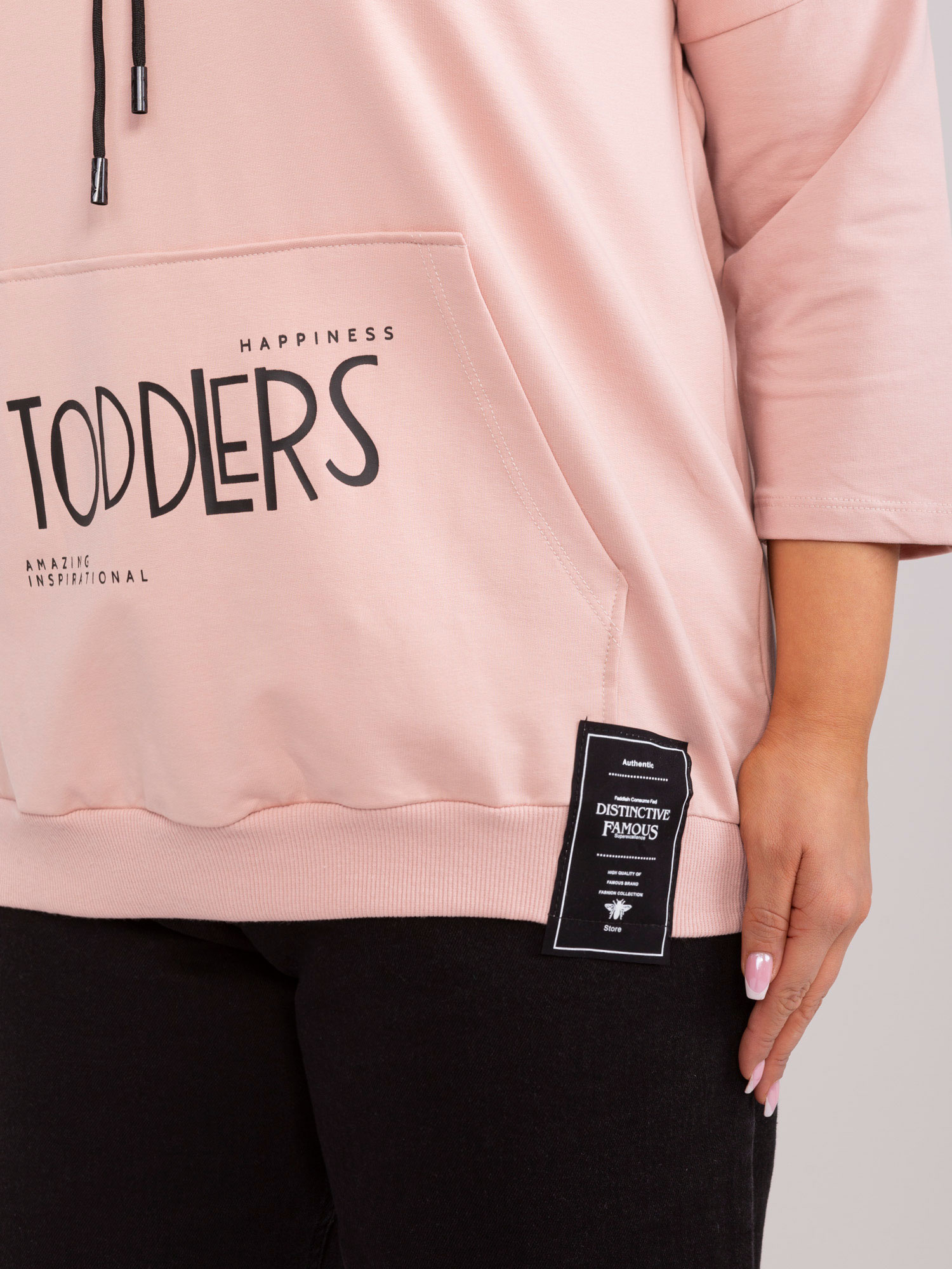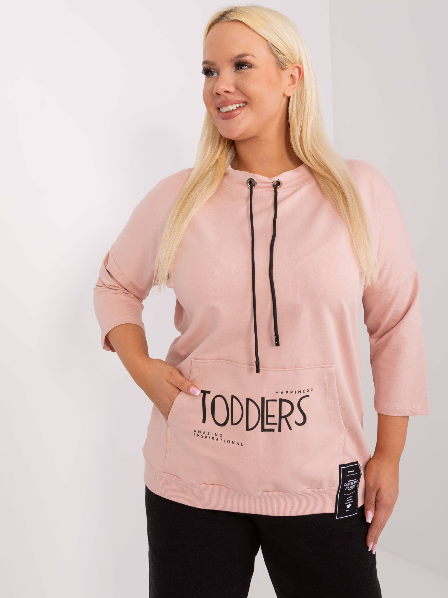 Wymiary bluzy w rozmiarze one size mierzone na płasko: szerokość pod pachami – 64 cm, długość całkowita – 64 cm, długość rękawa – 46 cm.
