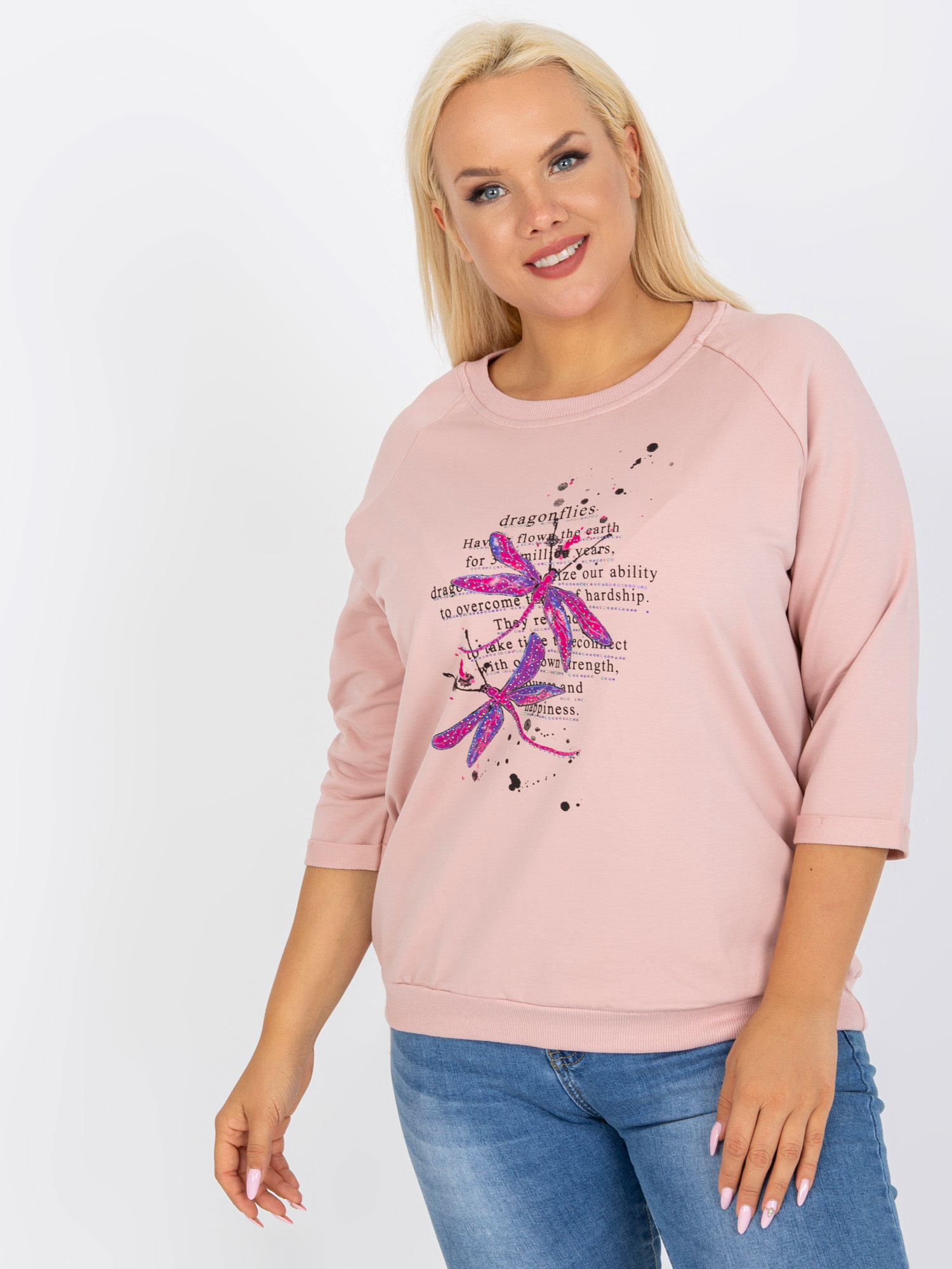 Jasnoróżowa bluzka plus size z nadrukiem i aplikacją .