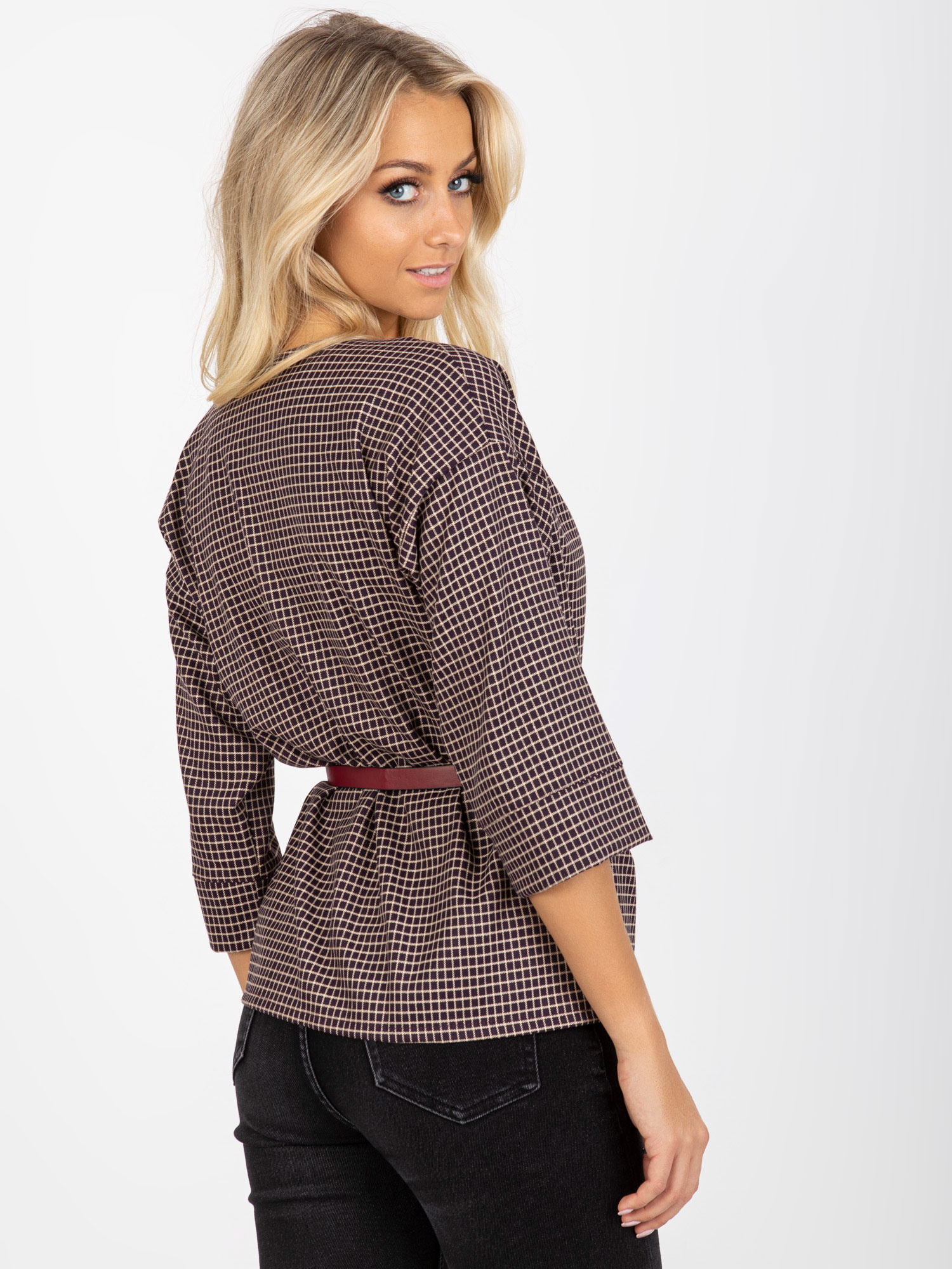 Wymiary bluzki w rozmiarze S mierzone na płasko: szerokość pod pachami – 48 cm, długość rękawa – 37 cm, długość całkowita – 64 cm.