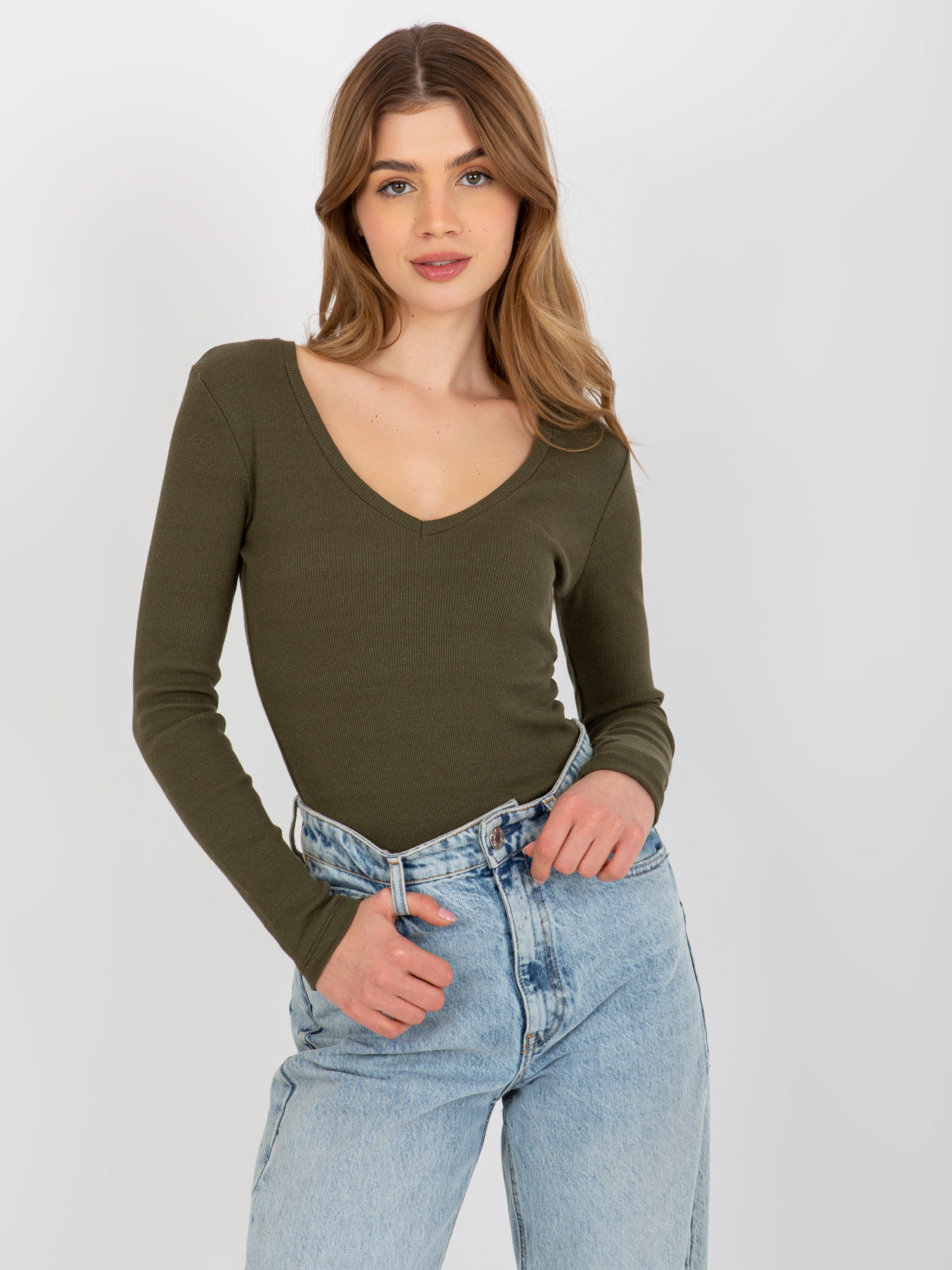 Khaki prążkowana bluzka basic z dekoltem w serek.