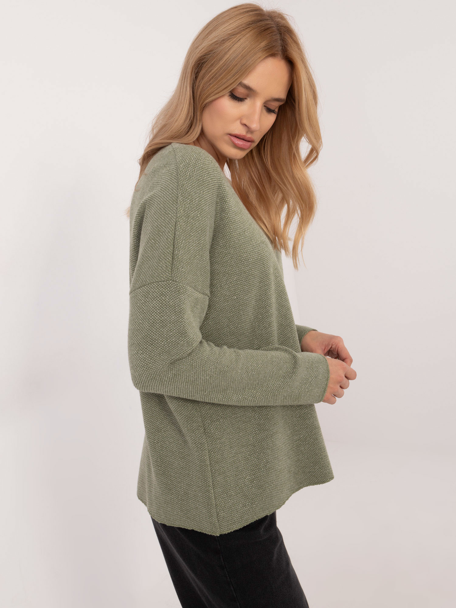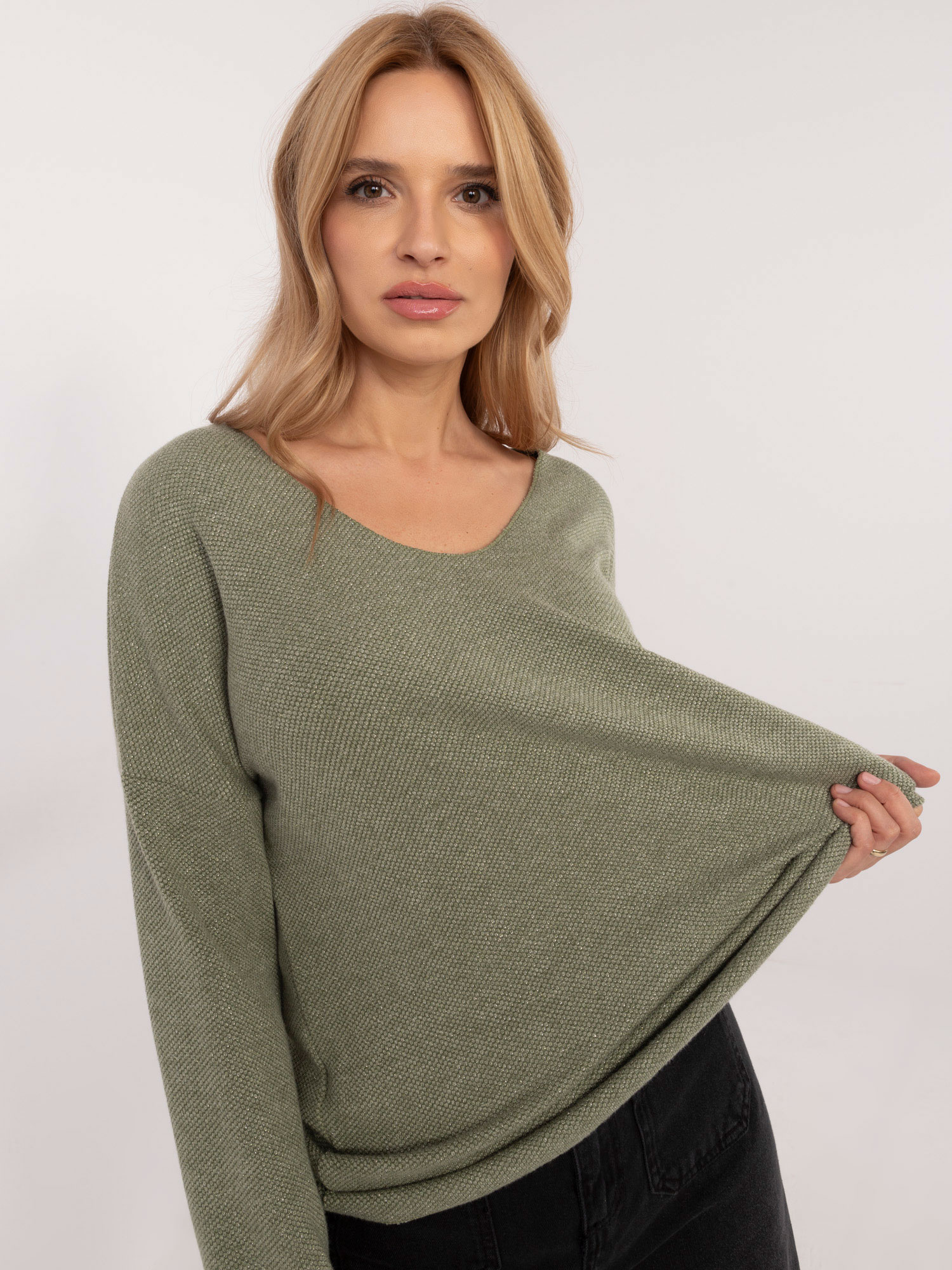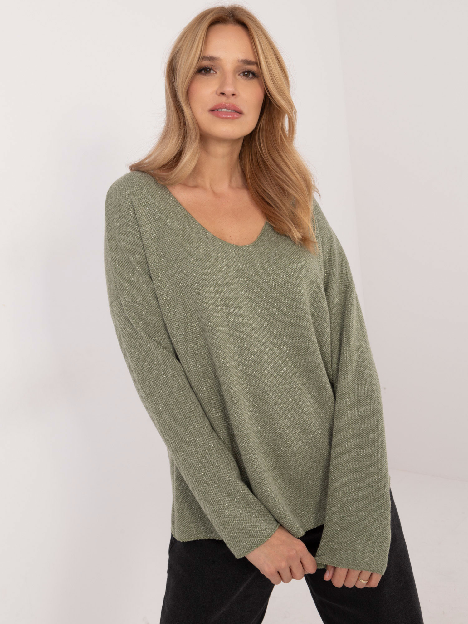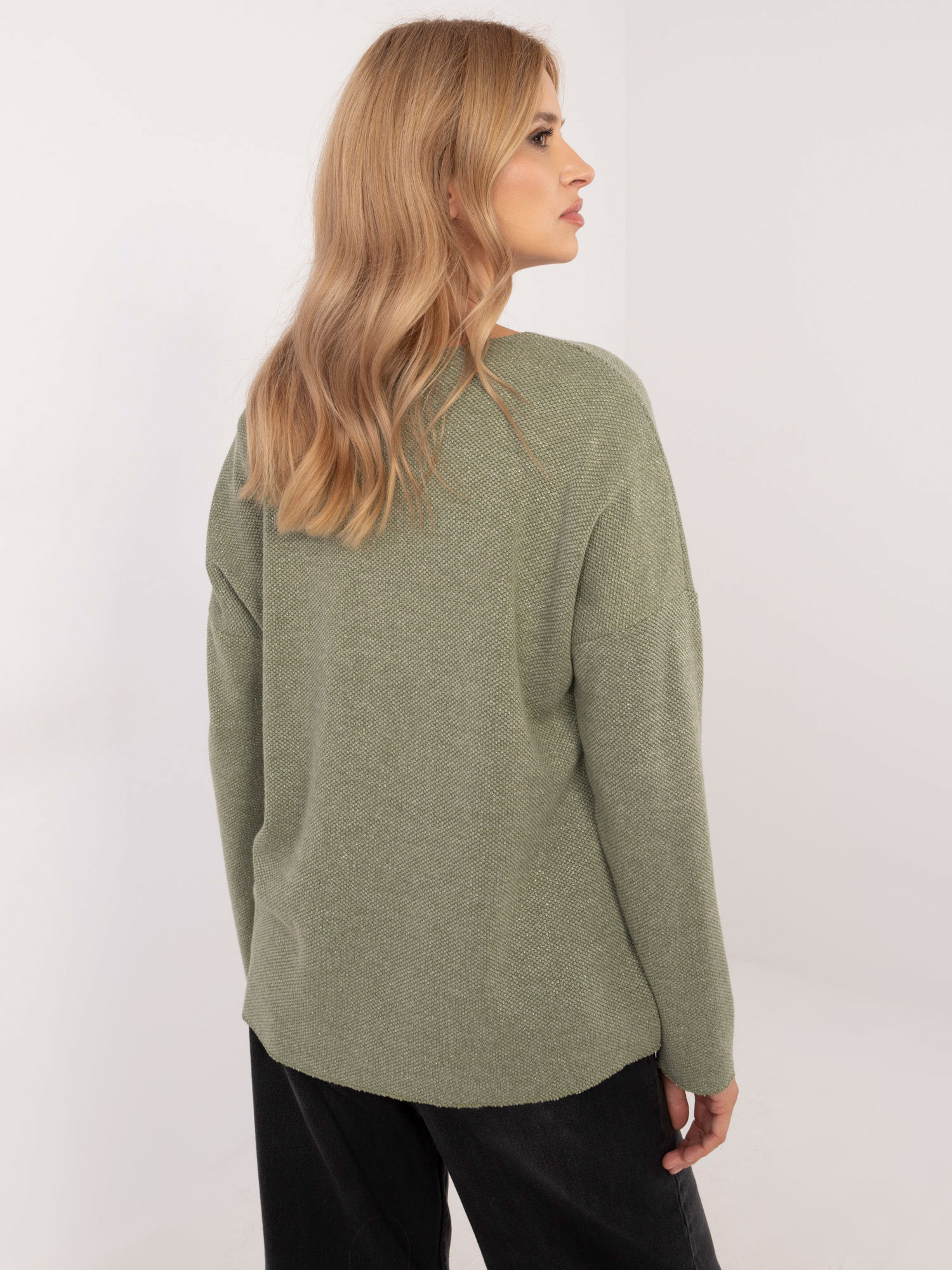 Wymiary swetra w rozmiarze one size: szerokość pod pachami – 62 cm, długość rękawa – 55 cm, długość całkowita – 61 cm.