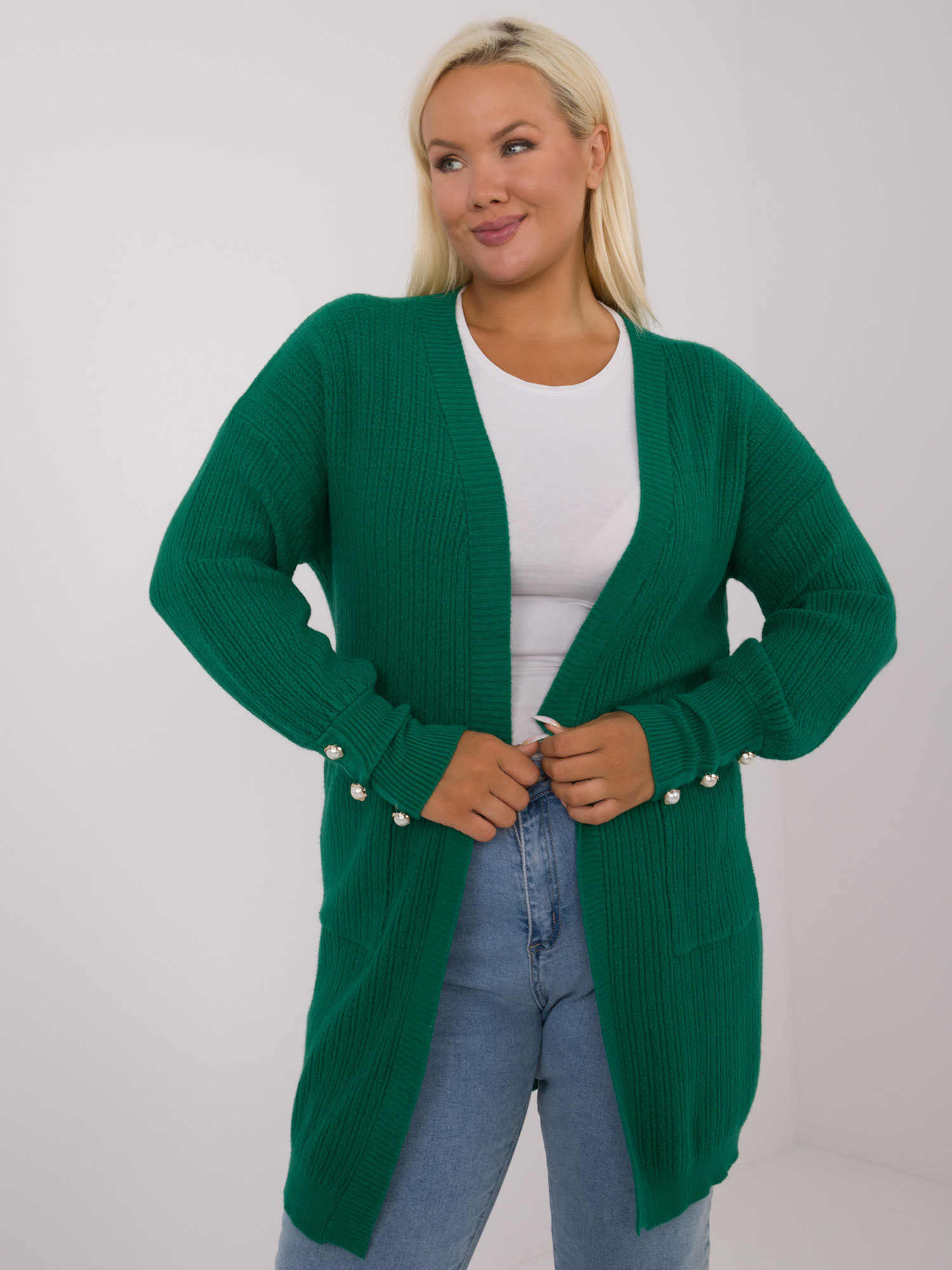 - Modelka: Modelka ma na sobie rozmiar one size. Wymiary modelki: wzrost 174 cm, biust 100 cm, talia 74 cm, biodra 107 cm
