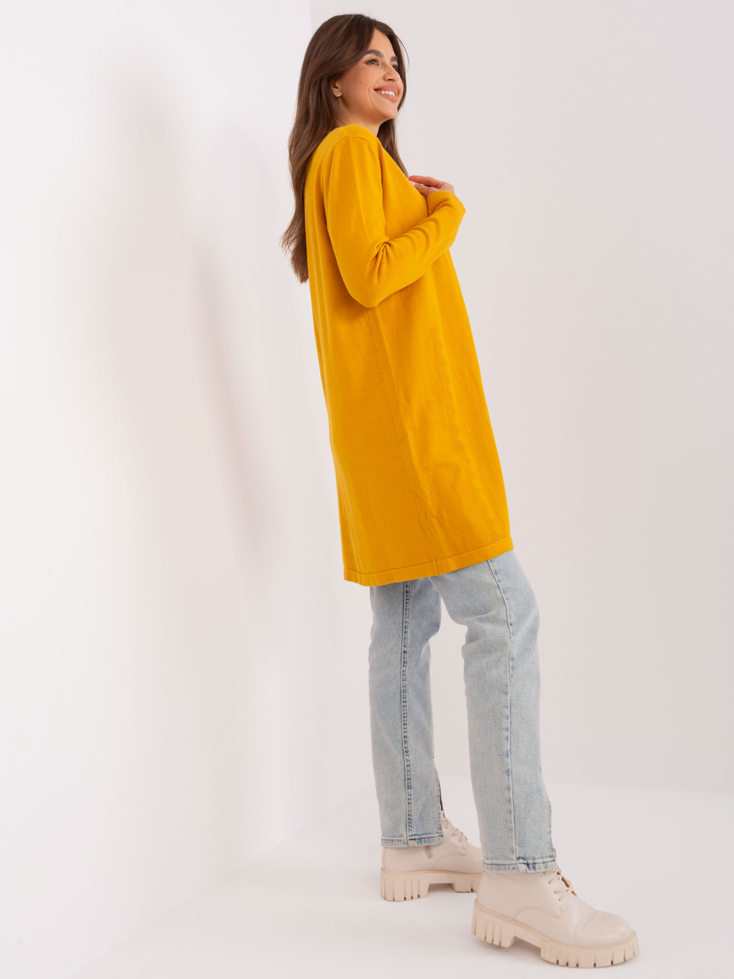 Modelka ma na sobie rozmiar one size. Wymiary modelki: wzrost 171 cm, biust 96 cm, talia 74 cm, biodra 109 cm.