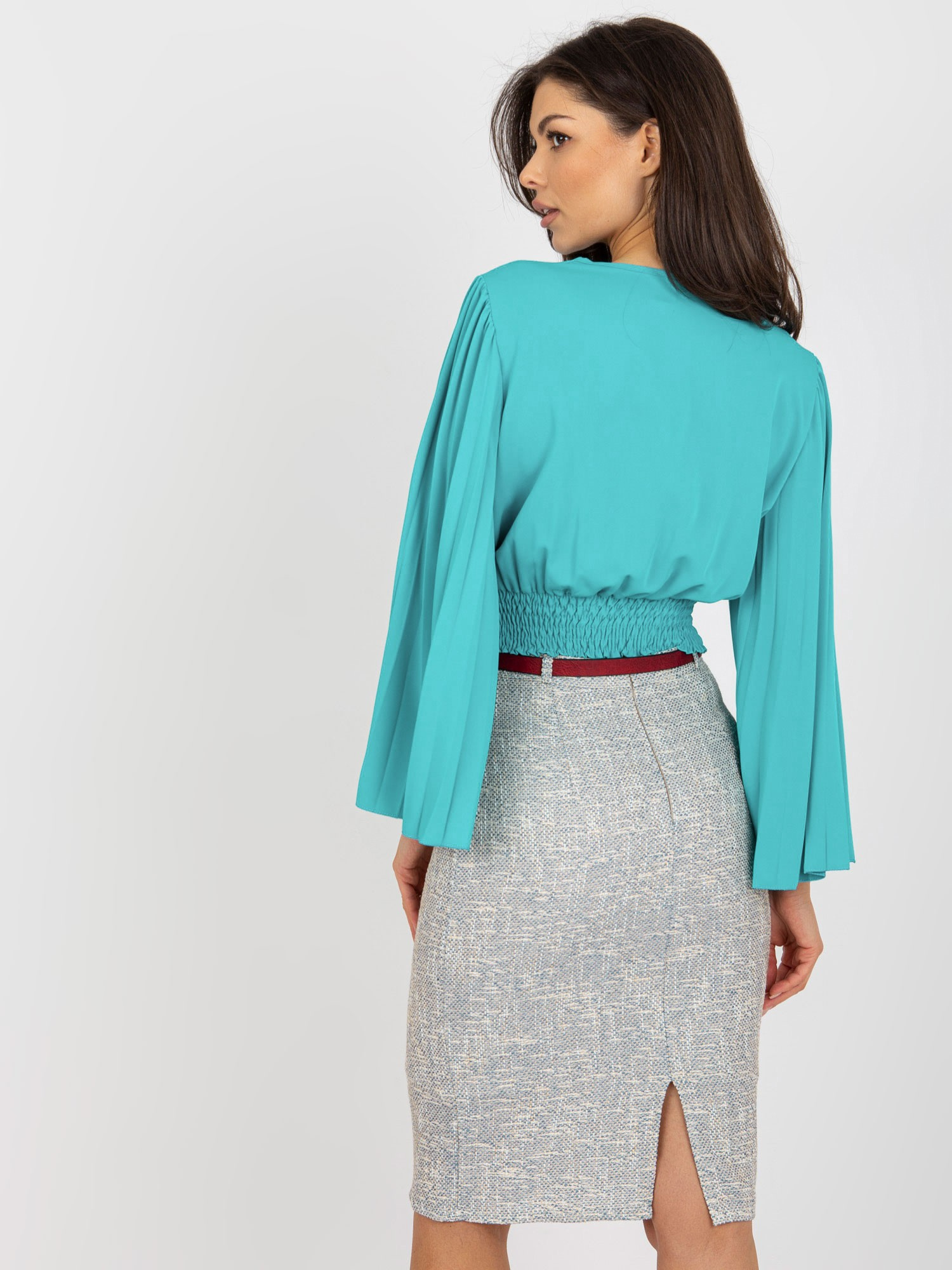 Niebieska bluzka wizytowa z kopertowym dekoltem .