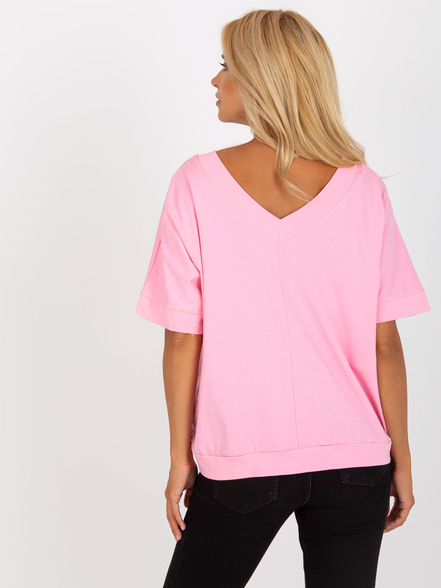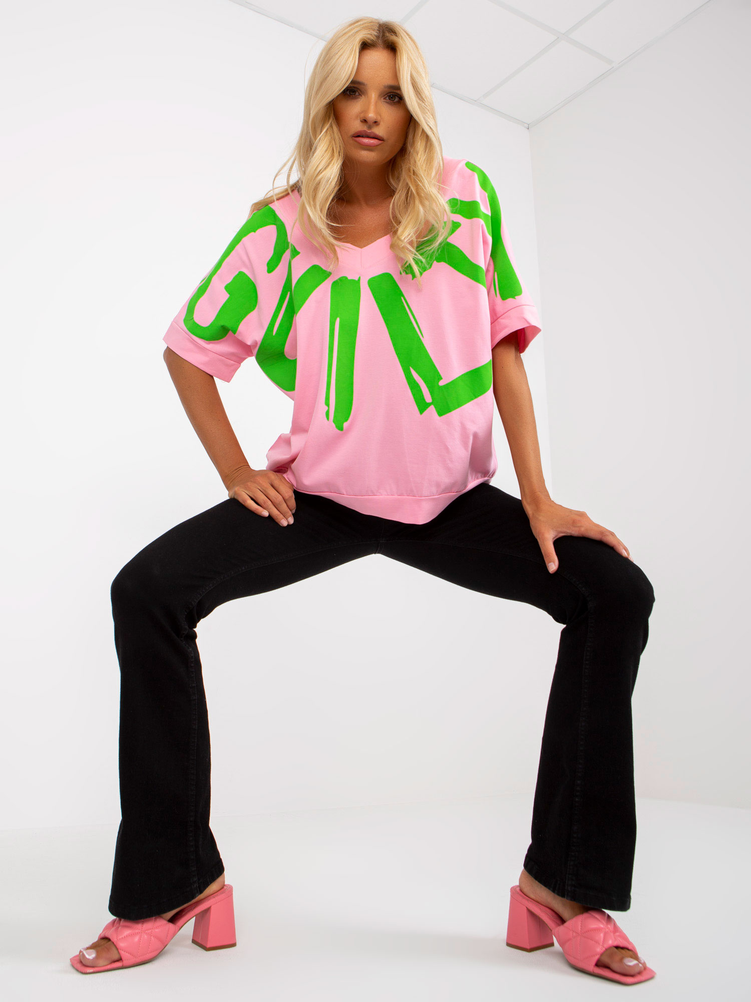 Rózówo-zielona bluzka z nadrukiem i dekoltem na plecach .
