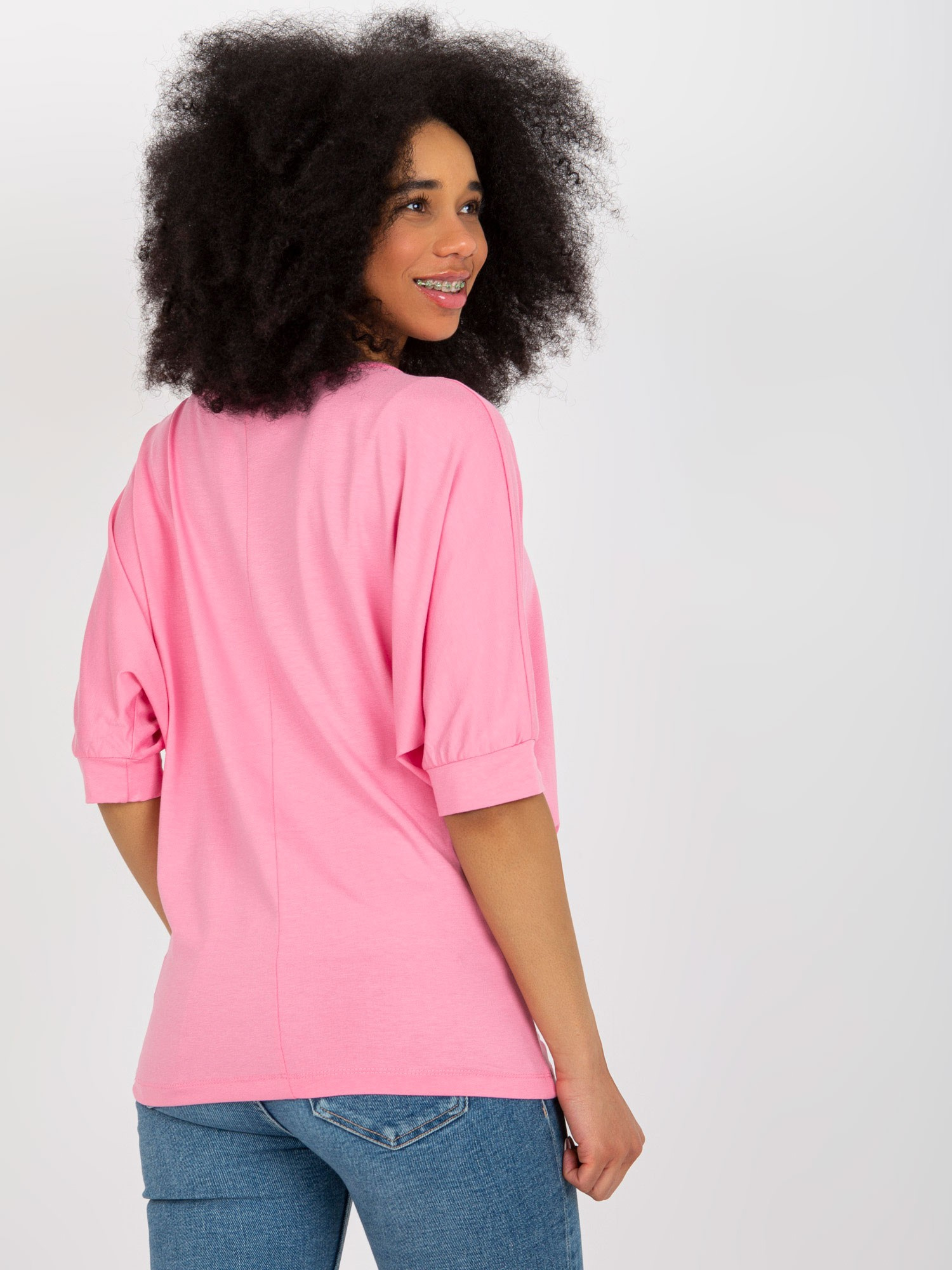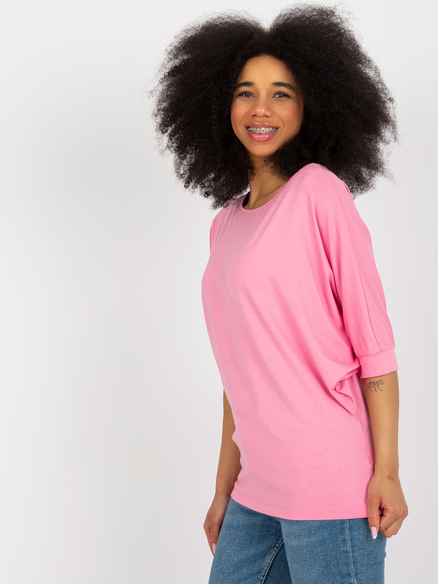 Wymiary bluzki w rozmiarze one size mierzone na płasko: szerokość pod pachami – 72 cm, długość rękawa – 35 cm, długość całkowita – 67 cm .