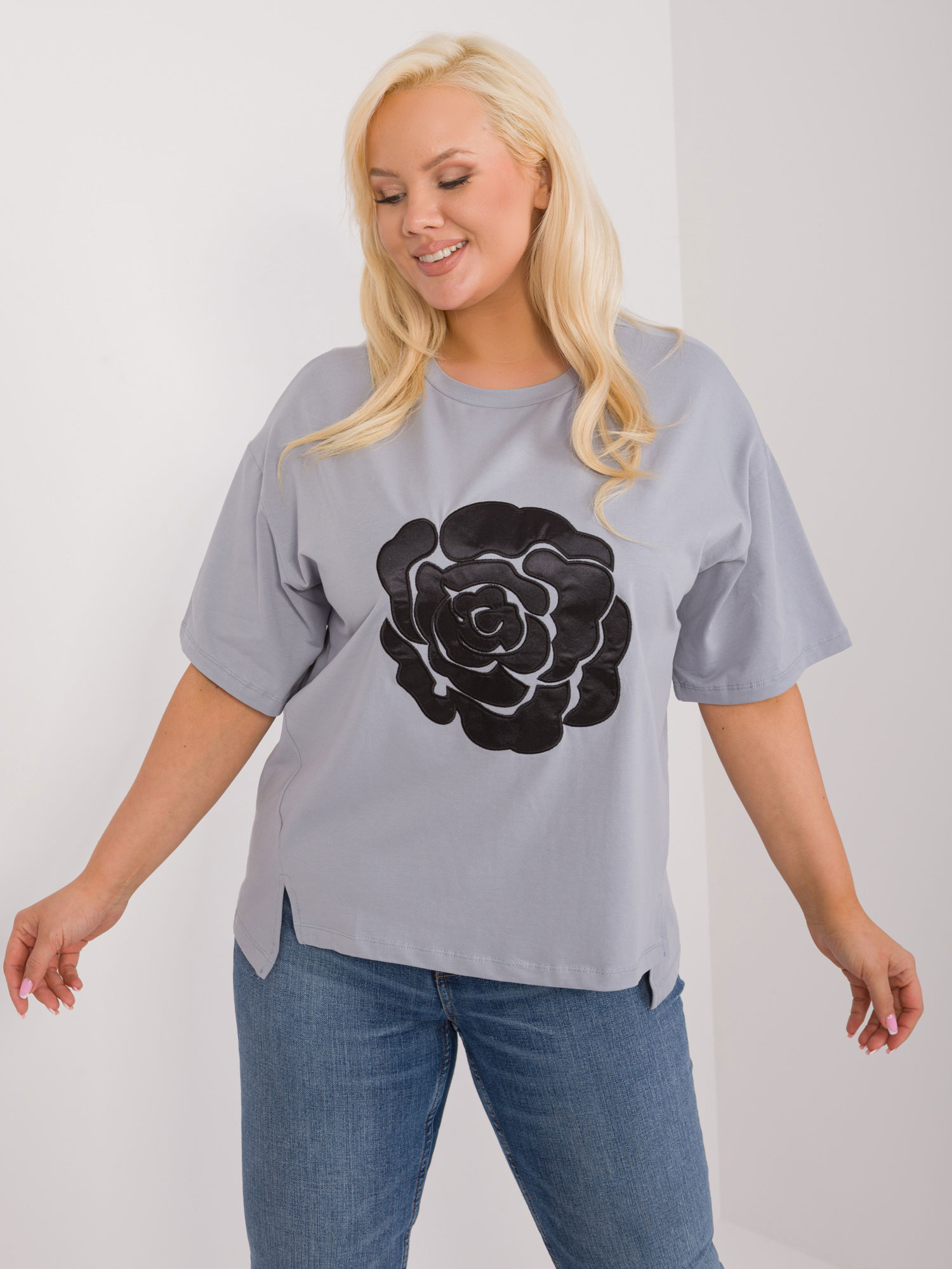 Wymiary bluzki w rozmiarze one size mierzone na płasko: szerokość pod pachami – 62 cm, długość całkowita (przód) – 67 cm, długość całkowita (tył) – 72 cm .