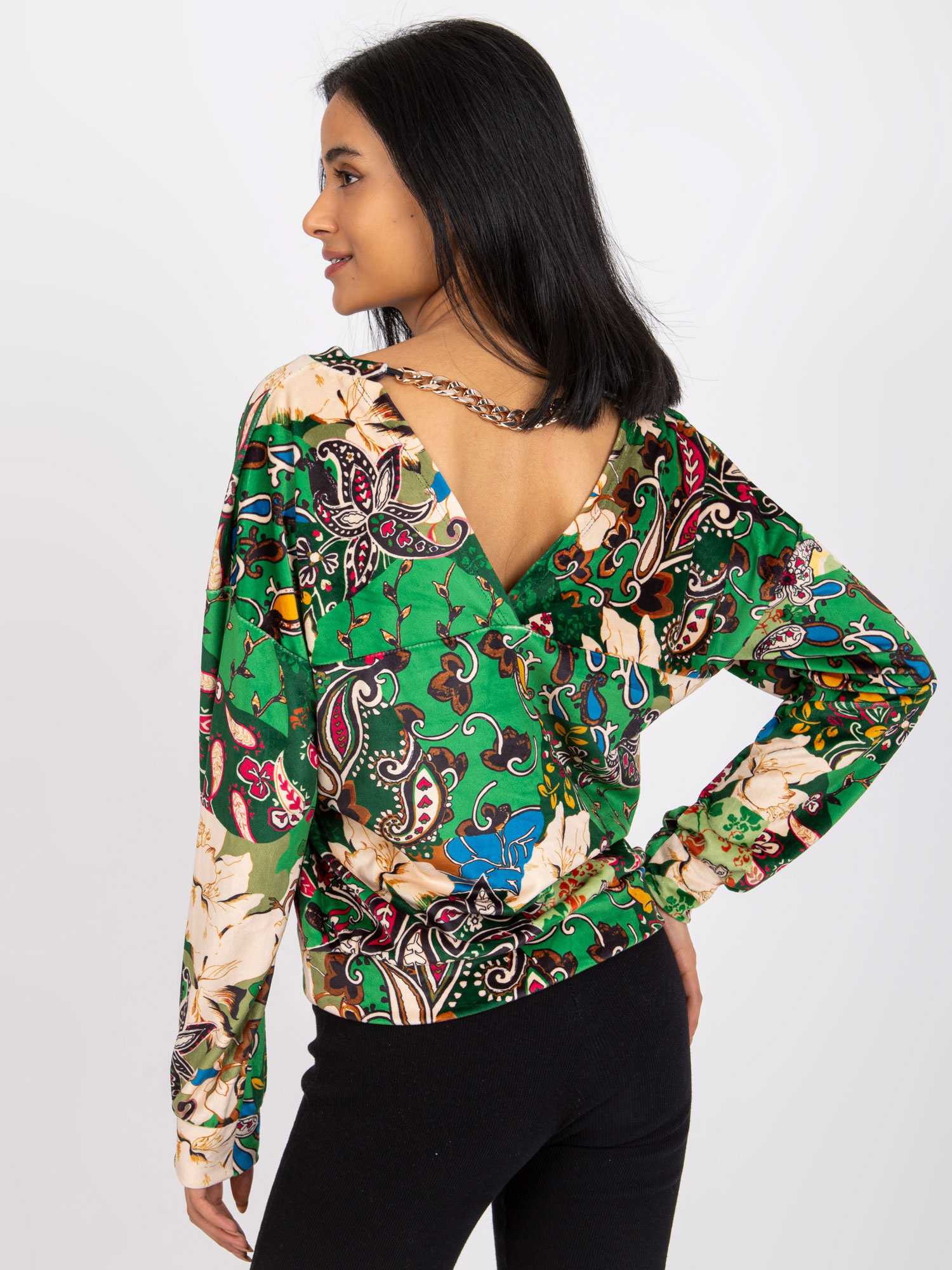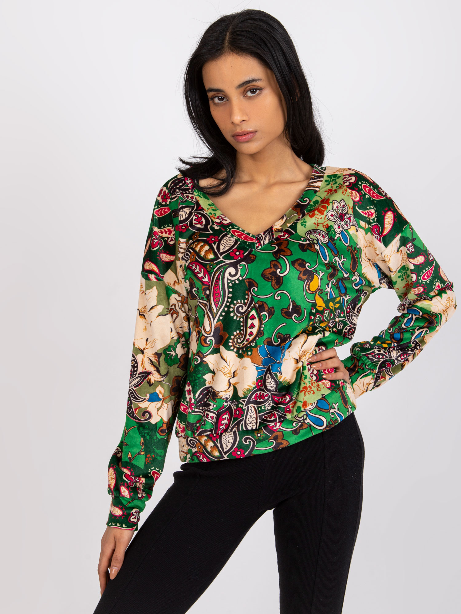 Wymiary bluzki w rozmiarze one size mierzone na płasko: szerokość pod pachami – 52 cm, długość całkowita – 59 cm, długość rękawa – 56 cm.