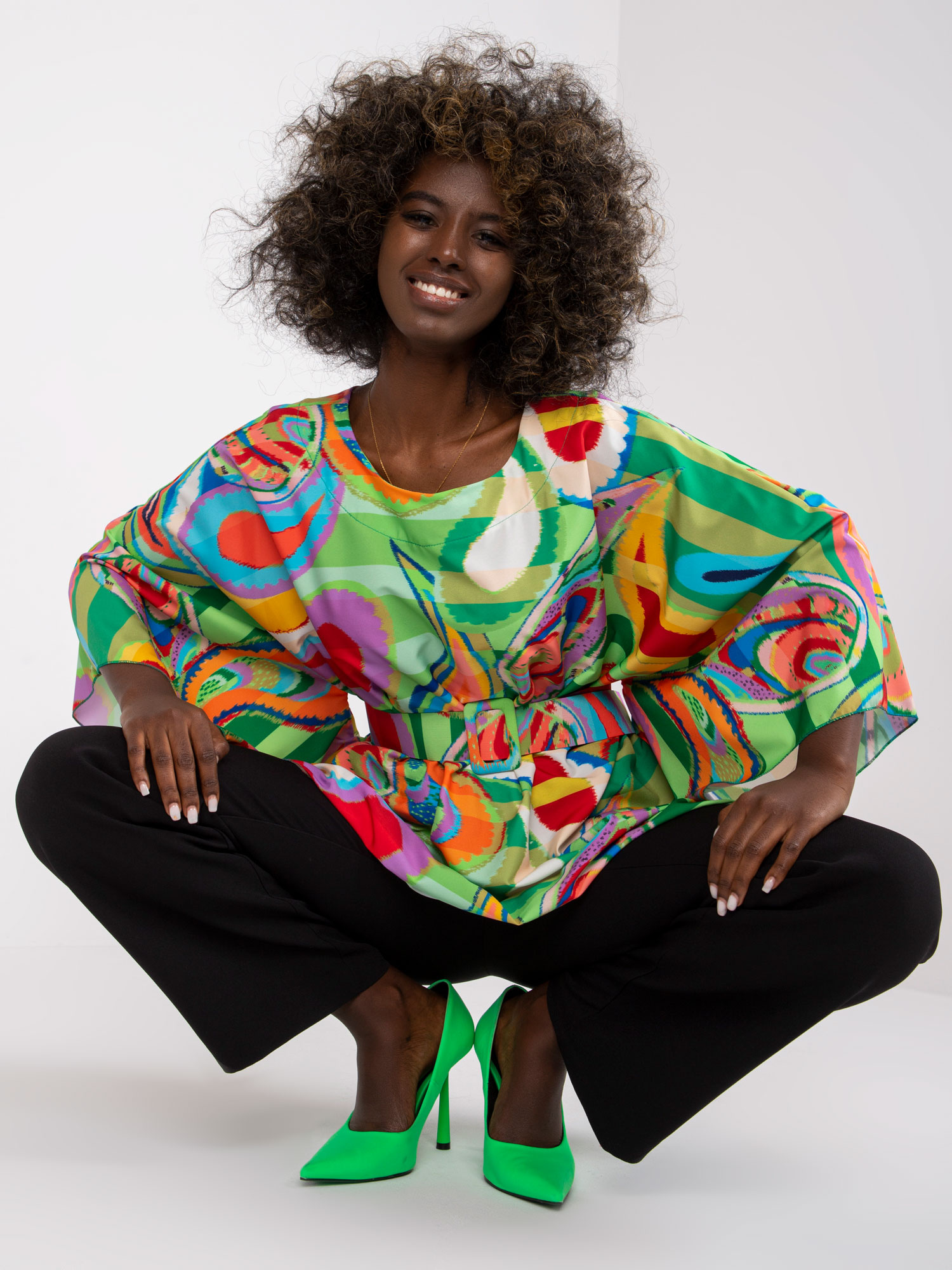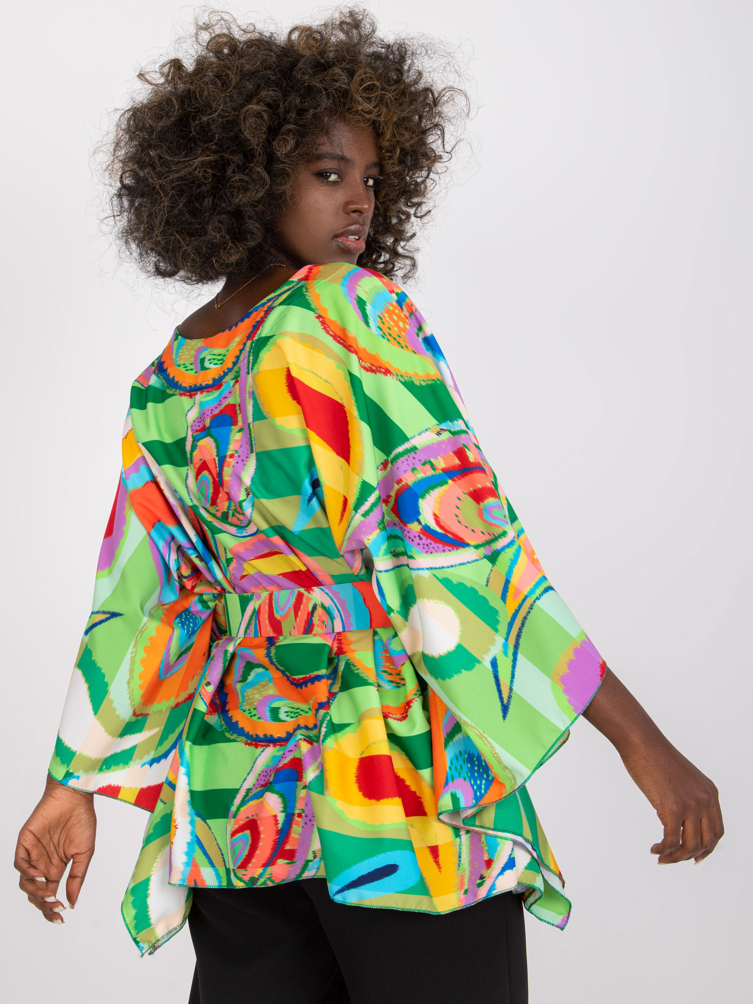 Wymiary bluzki w rozmiarze one size mierzone na płasko: szerokość pod pachami – 73 cm, długość całkowita – 68 cm, długość rękawa – 45 cm.