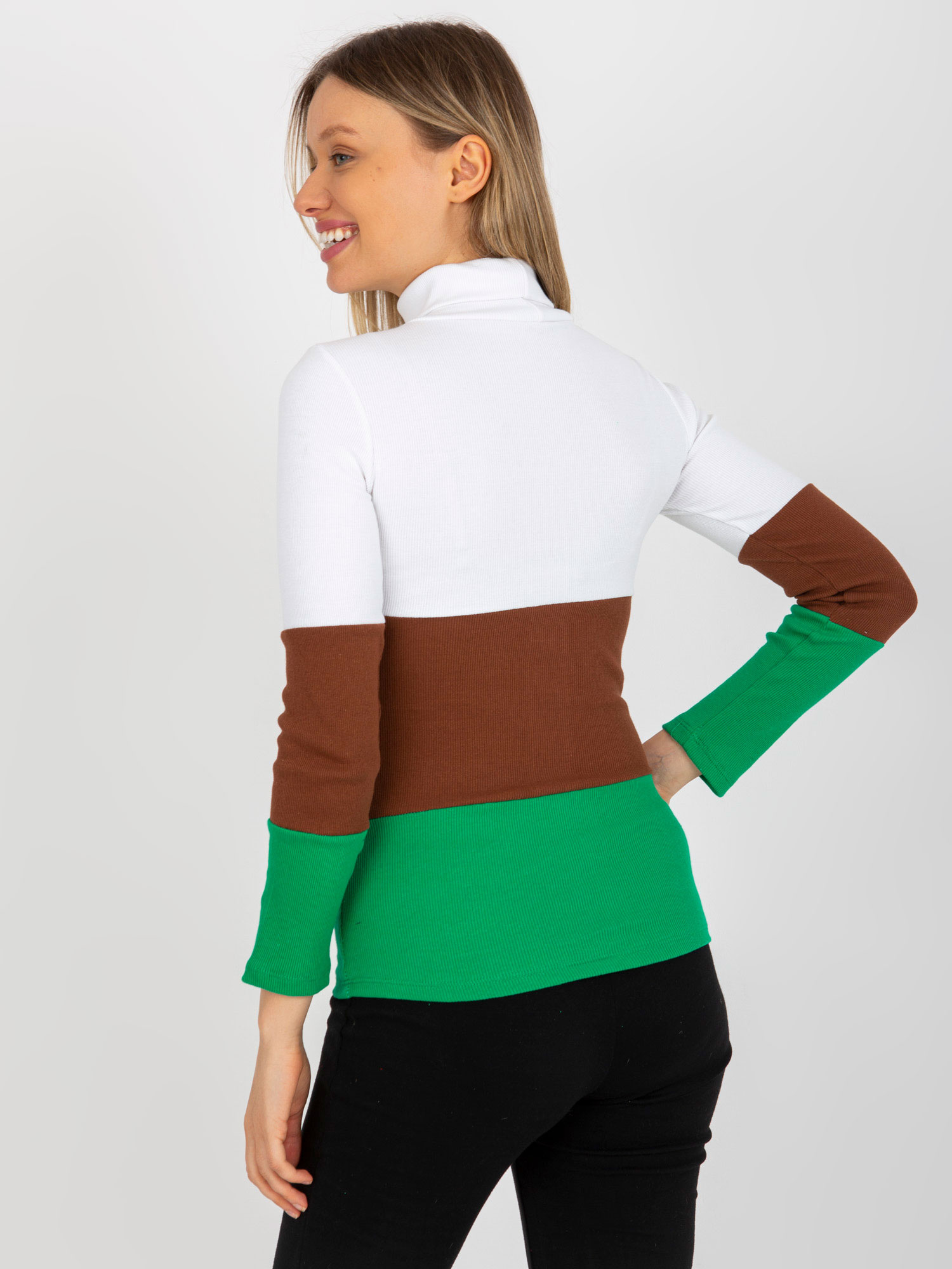 Ecru-zielona dopasowana bluzka basic z golfem w prążek .