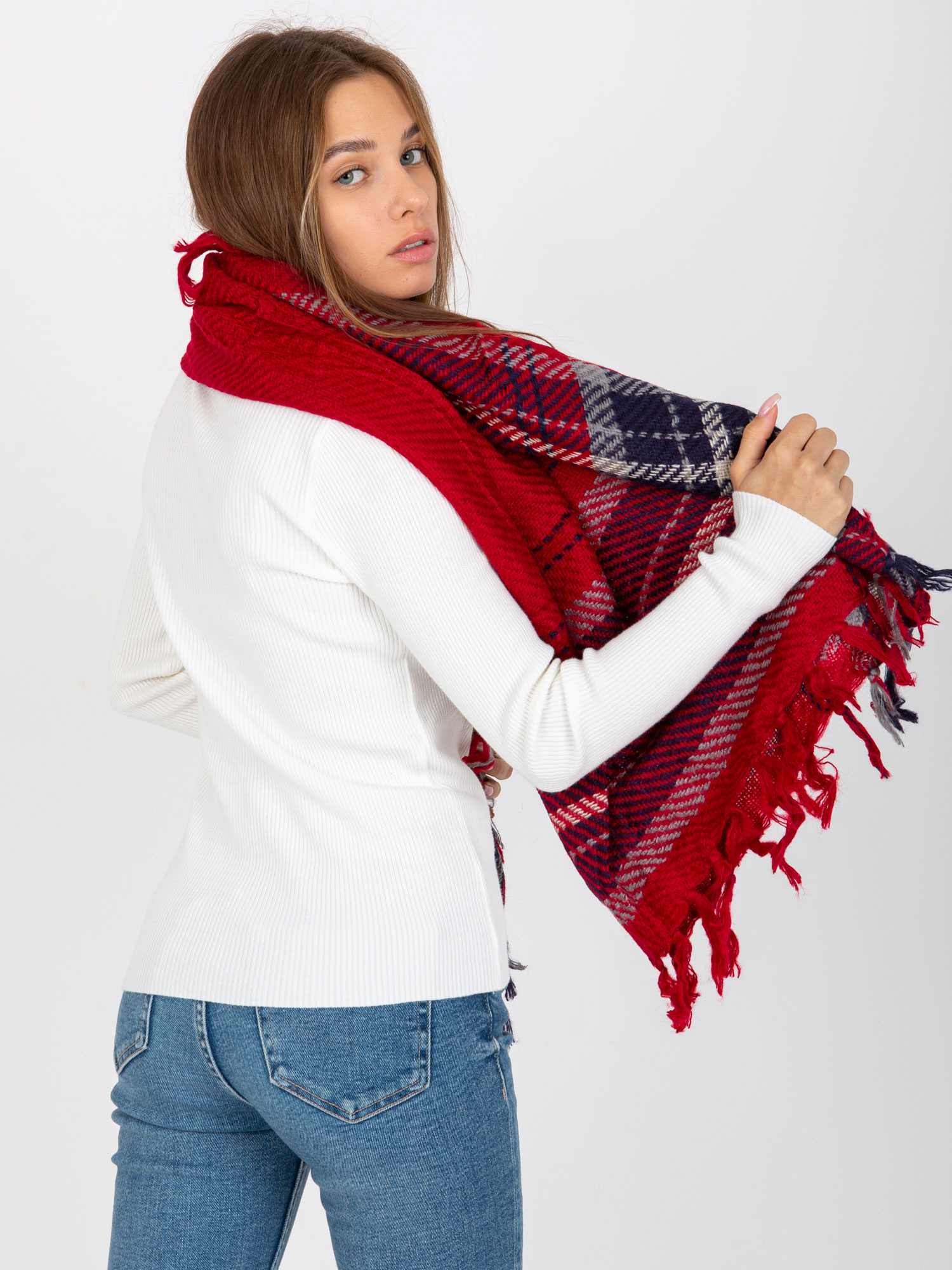 Czerwony szalik damski z frędzlami .